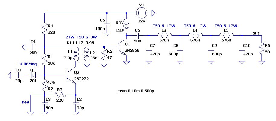 > bekomme ich nicht mehr als +-7V Spitze... Das sind in der Simulation 36Vss. Es gibt Effekte durch die Miller-Kapazität vom Q1. Hier kommt man mit der Simulation nicht weiter. > Was macht C2 parallel zu L5? (f(R) wäre ca. 3,3MHz) Sonst macht der Kollektor vom Q1 2-4 Schwingungen. C2 wird transformiert und liegt später parallel zu C7. Außerdem liegt er parallel zur parasitären Induktivität des UnUn. > Schätze, C11 und L4 bilden einen Resonanzkreis zur > Abfilterung der ersten Oberwelle (ca. 28MHz). Das ist ein Kerb- bzw Notchfilter. Ohne dieses Filter kommen die 28 MHz noch mit -30dB durch. Das sind zwar nur 18µW, aber immerhin ein paar km weit hörbar. Unter AADE Filter Designer wäre dies ein Cauer-Filter. Das echte Cauer-Filter erzeugt mit jeder Induktivität eine weitere Kerbe. Dadurch wird aber die Weitabfilterung schlechter.