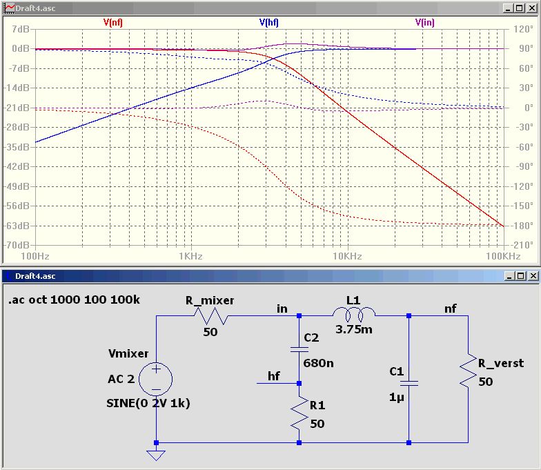 Ein Diplexer entspricht in etwa einer Frequenzweiche beim Lautsprecher. Die Hauptaufgabe ist jedoch, den Diodenmischer breitbandig mit 50 Ohm abzuschließen und gleichzeitig nur das NF-Signal (bzw. ZF-Signal) zum Verstärker durchzulassen. Der zweite Pfad vernichtet einfach die HF in einem 50 Ohm Widerstand. Im angehängten Bild sollte Vin waagerecht bei 0 dB verlaufen. Die Schaltung ist nicht ganz perfekt, denn es handelt sich um einen Hochpass erster Ordnung und einen Tiefpass zweiter Ordnung. Da entsteht automatisch etwas Welligkeit. Dein Problem wird sein, bei einer noch tieferen Grenzfrequenz von z.B. 1 kHz eine entsprechende Drossel zu finden. Je besser das klappt, desto kleiner wird das oben erwähnte Großsignalproblem. Die Induktivität sollte bei 15-20mH liegen mit einem Drahtwiderstand im einstelligen Ohmbereich. Eventuell geht es mit einer stromkompensierten Drossel von 2x4,7 mH, bei der die Wicklungen in Reihe geschaltet werden. Dann müssen die anderen Bauteilwerte daran angepasst werden. > Erste Beobachtung: Nach dem Einschalten driftet er (immer langsammer) > ca. 10 - 15 Minuten nach oben (Δf ca. 5kHz) und bleibt dann stehen. Das ist ja erstmal nicht schlecht. Kannst Du rausfinden, welches Teil am meisten driftet? Hast Du einen Frequenzzähler? > die Zeichen "sprechen von selber" als Merkwörter Gibt es eine Seite, wo ich das mit den Merkwörtern nachlesen kann?