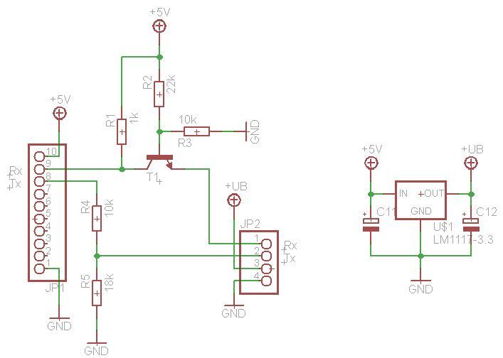 Also Rx wird normal mit Tx verbunden. Tx über Sp.-Teiler 10k 18k an Rx 3,3V Seite könnte gehen aber meiner Meinung zu hochohmig besser Sp.-Teiler 1k 1,5k. Wenn Tx 3,3V an Pin1 JP2 hängt dann muss der 3,3V den Transi sperren, das könnte funktionieren da sie Basis ca 1/3 von 5V hat. Meistens geht das wie vermutet auch ohne Pegelwandler.