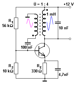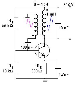 Der Transistor ist erstmal mit vernünftigem Arbeitspunkt "aufgehängt". In dem Zustand verstärkt er bloß das Rauschen an den Widerständen und an seiner BE-Diode. Der Schwingkreis am Ausgang, 10nF || 1mH, bestimmt die Frequenz. Da das Übersetzungsverhältnis für Spannung = 4 ist, ist es für Impedanzen = 16. Die Spule, die da an der Basis hin gewickelt ist, hat also eine viermal so niedrige Impedanz wie der Ausgang. Das sorgt für wenig Dämpfung und man kann die Basis des Transistros sogar niederohmig ansteuern(was man bei entsprechender Verstärkung des Transistors nicht müsste). Der 100n- Kondensator schneidet alle Gleichspannung von der Spule weg, dass man den Transistor mit Wechselspannung um seinen Arbeitspunkt "herumeiern lässt". Die Spulen sind gegensinnig gekoppelt, dass die Spannung an der Basis AC-mäßig negativ zum Ausgang ist. Der Transistor invertiert das Signal von Basis zu Kollektor nochmals, dass sich insgesamt 360° = 0° Phasendrehung ergeben(Teil 1 der Schwingbedingung, es muss die Phase um n*360° gedreht sein). Der Transistor bringt, da der Emitterwiderstand AC-mäßig seiner Wirkung beraubt ist, seine Leerlaufverstärkung, die meist größer als -100(s.o., 2.Phasendreher mit dem Trafo) ist. Das ist größer als das Spannungs-Übersetzungsverhältnis des Trafos. Es ergibt sich eine Closed-Loop-Verstärkung von größer als 1(zweite Schwingbedingung). mf