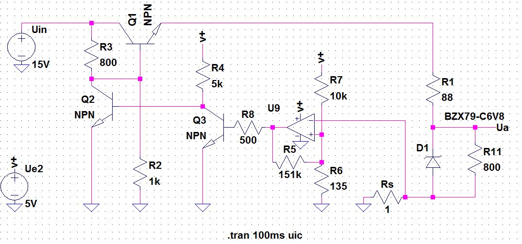 Hi, ich brauche eine Schaltung die mir aus 15V Eingangsspannung 6,8V Ausgangsspannung erzeugt. Wollte da nicht unbedingt auf einen LM317 zurückgreifen, weil ich den nicht hier hab. Um dabei noch was zu lernen, wollte ich das komplett diskret aufbauen bzw. hab mir was dazu überlegt was nicht funktioniert ;) Aber ich arbeite mich erstmal von Anfang an durch, zuerst wie Falk Brunner das empfohlen hat.