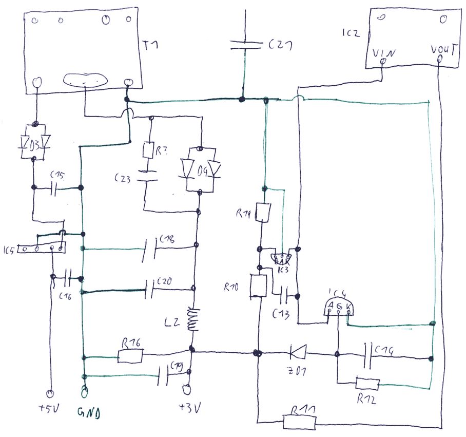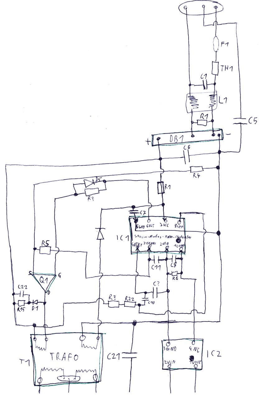 Hallo Experten! Ich lese hier schon lange mit, doch dies ist mein erster Beitrag in diesem Forum. Ich habe ein Problem mit einem Netzteil aus einem Switch, das ich trotz Google und Foren-Suche nicht lösen konnte. Ich würde nämlich gern verstehen, wie dieses Netzteil arbeitet. Der Auslöser war, dass zwei baugleiche Switch-Netzteile nahezu zeitgleich ihren Geist aufgegeben haben, möglicherweise durch die hohen Temperaturen oder die Gewitter in letzter Zeit. Die Symptome waren ein regelmäßiges Ticken (vielleicht 2 Hz) der Netzteile und eine im Takt damit einbrechende Ausgangsspannung. Inzwischen funktioniert eines der Netzteile gar nicht mehr. Daran, die Netzteile reparieren zu wollen, traue ich mich nicht, dennoch würde ich, wo sie schon offen vor mir liegen, gerne die Chance nutzen, die Funktionsweise verstehen zu können. Wenn ihr (ungefährliche) Tipps zur Reparatur habt, wäre ich da natürlich auch nicht abgeneigt. Jetzt aber genug der Vorrede, sondern zu den technischen Daten: Die Netzteile stammen von einer Firma namens Wowson und liefern 3,3 V bei 5 A und 5 V bei 1,5 A. Das Ticken scheint aus dem Trafo (oder der Umgebung) zu kommen. Ich habe versucht, Schaltpläne von dem guten Stück zu zeichnen, diese werde ich an zwei weitere Posts anhängen. Die Bauteile sind von unten gezeichnet. Von der Funktionsweise her scheint es mir aber ähnlich zu diesem hier http://www.mikrocontroller.net/forum/read-1-141164.html#141207 zu funktionieren. Wenn jemand Rückfragen zu meinen Plänen hat, gern! Bitte entschuldigt auch, dass ich nicht immer die offiziellen Symbole verwendet habe. Die ICs, die eingesetzt werden, sind (soweit korrekt identifiziert): Q1: Beschriftet mit K2625 IC1: Strom-Modus PWM-Controller (TL3832P) IC2: Spannungsregler (S-817) IC3: Beschriftet mit L432NA DDH11 (sieht aus wie ein Transistor) IC4: Transistor (XL1225) IC5: Spannungsregler (278ra05) Interessieren würde mich besonders, wozu dieser ganze Kleinkram da ist, die ganzen ICs etc. Außerdem frage ich mich, wieso der Trafo auf Hochspannungsseite zwei Spulen hat. Und noch eine Frage: Wieso bestehen D3 und D4 aus je zwei Dioden, würde eine nicht auch reichen (die sind in einem hoch stehenden Gehäuse, ähnlich wie ein Spannungsregler, zusammengefasst)? Nun dann, vielen Dank an alle, die bis hierher durchgehalten haben, stedaho
