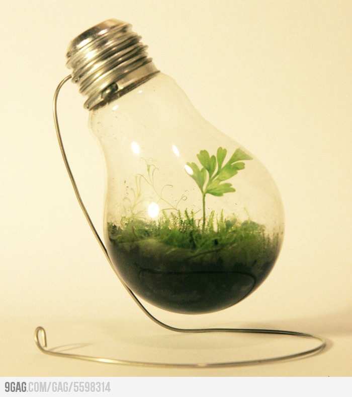 Da gehen nur Moose oder Farn so wie auf dem Bild. Vielleicht noch Kakteen oder Litops. Alles andere wuchert Dir die Lampe schnell zu und vergammelt dann. Ich hab mal eine Eco-Sphere gebaut: Ein Schraubdeckelglas, darein Sand, Wasser, Fadenalgen, Wasserflöhe, oben paar cm Luft lassen, zuschrauben, vorsichtig umdrehen, mit Deckel nach unten aufstellen. Hat mehrere Jahre durchgehalten, gab auch immer Zyklen verstärkten Algenwachstums, dann waren die Flöhe weg, plötzlich wieder da. Ein geschlossenes Ökosystem, das nur Licht von aussen bekam. Hat glaub ich länger funktioniert als BioSphere II. ;-)