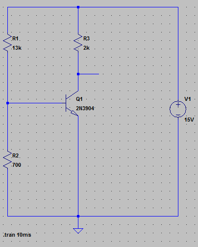 Da ich auch überprüfen wollte ob ich mit dieser Methode zu einem richtigen Ergebnis gekommen bin, habe ich die Schaltung in dem Programm LTspice simuliert. Ich erhalte jedoch nur Uce = 173mV. Weiters bin ich weder mit unterschiedlichen Ube bzw. hFE Werten annähernd zum richtigen Ergebnis gekommen. Entweder sperrt der Transisotr zuviel oder er schaltet zuviel durch. Auch bei dem einfachen diskreten Schaltungsaufbau konnte ich keine Uce = 5V messen. Nun meine Frage, hab ich bei der Berechnung etwas falsch gemacht, bzw. wie berechnet man den die Widerstände zur Arbeitpunkteinstellung richtig für dieses Beispiel? Muss man auf bestimmte Werte des Datenblatts aufpassen? Datenblatt habe ich folgendes verwendet: http://www.fairchildsemi.com/ds/2N/2N3904.pdf Vielen Dank im voraus! LG M