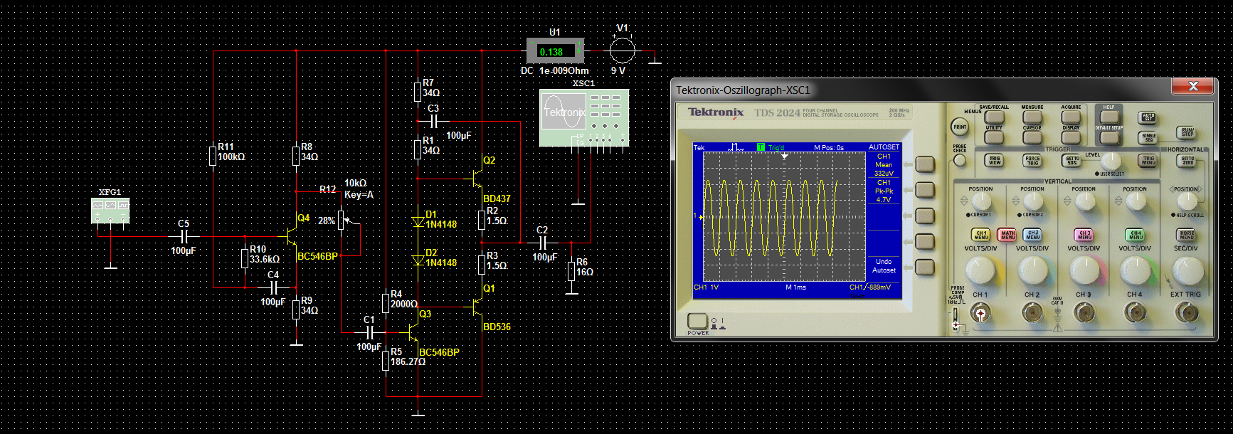 Hallo liebe Gemeinde. Ich hab mal ne Frage: Diese Schaltung oben hab ich erstellt, dimensioniert und dann die RECHNERISCHEN!!!!! Werte in Multisim mithilfe einer Simulation getestet... der Eingangswiderstand ist dank der BootStrap (nicht perfekt da kein Spannungsteiler ich weis) auf rund 9kOhm gesezt was für meine Zwecke (Gitarrenamp) ausreicht. Nun meine Frage: Wie zusehen gibt es am Ausgang eine schöne Sinus mit 4,7Vpp so, wie es sein soll... Wenn ich die Schaltung allerdings auf dem Steckbrett habe und Sinus reinschicke dann bekomm ich einfach keine Sinus am ausgang hin,.. das liegt wohl daran dass ich am Collector vom Treiber Q3 bereits eine Rechteckspannung habe!?!? Das kann allerdings doch ausschlieslich mit dem AP des Q3 zusammenhängen der wiederrum laut Multisim super funktioniert. Was kann also noch eine derartige Veränderung im Real Life der schaltung bewirken!? Wäre Über Hilfe dankbar ... Falls benötigt kann ich noch ein Bild vom Oszi machen damit Ihr mal seht was am ausgang fürn Murks herauskommt. :) Lg.