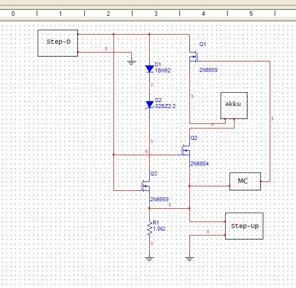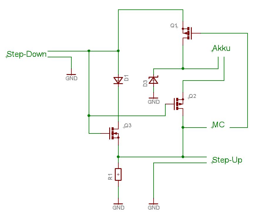 Hallo Dirk, anbei eine eventueller Ansatz zur Lösung deines Problems. Die Werte des Widerstandes und die Bezeichner der FETs bitte ignorieren, ist vom Programm so vorgegeben. Lediglich mal das Prinzip. Hab das nur auf die schnelle mal gezeichnet! Also: Q2 schaltet die Akkuspannung (Source) auf deinen MC, sobald dein Gate negativer ist als die Akkuspannung (also wenn die Spannung ausfällt). Q3 legt dir die Spannung vom Wandler auf deinen MC, solange das Gate von Q3 positiver als dessen Source ist (5V > U(R1)), wobei das knapp werden könnte. Q1 wird vom MC geschalten, um deinen Akku zu laden. Das Prinzip funktioniert aber nur, wenn du entweder (am Ausgang vom Step-Down) Umax oder ~0V hast. Bei schwankenden Spannungen werden die FETs nicht eindeutig schalten. Vllt hat ja jemand ne andere Lösung !?