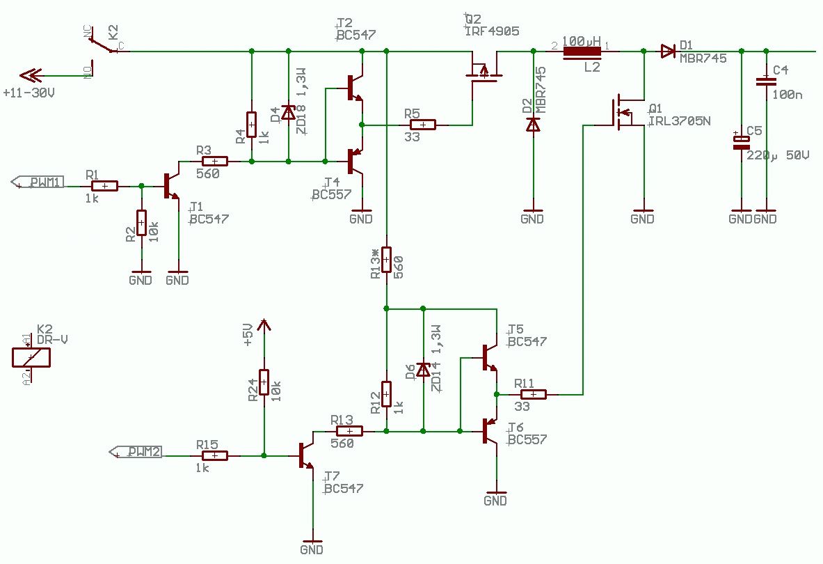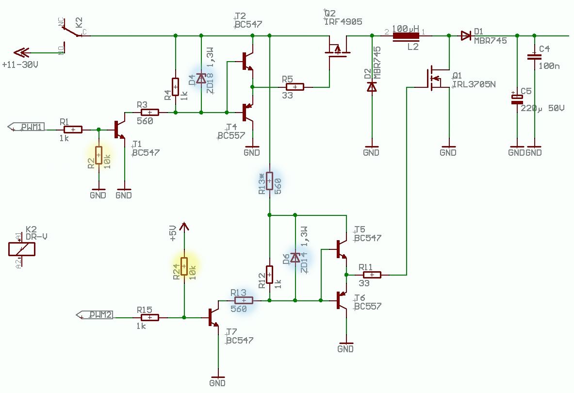 Hallo, ich möchte den Lader von der Codesammlung Bleiakku-Lader 12/24V (die Interne Verlinkung gehr nicht !?) www.mikrocontroller.net/topic/72627 um einen Boost Teil erweitern Dazu habe ich zwei Fragen 1. Die Spannungsbegrenzung des Gates von Q1 (Boost) kann ich ja nicht aus dem oberen Teil übernehmen (ist ja ein N-Kanal). Würde das funktioneren wenn ich dafür den R13 weglasse und durch den R13* ersetze oder muss die Z-Diode direkt ans Gate ? Dazu müsste ich aber R11 deutlich erhöhen. 2. Für einen definierten Zustand des PWM2 habe ich statt dem PullDown einen PullUp Widerstand (R24) eingefügt. Damit sollte doch der zweite FET gesperrt sein oder habe ich da einen Denkfehler ? Bitte schau deoch mal jemand drüber Danke und Gruss PS.: habe die Stellen im Bild farbig markiert - leider bekomme ich das erste Bild aber nicht mehr gelöscht...