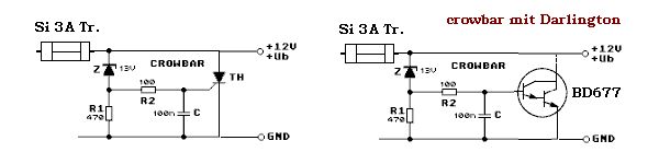 Hi, links im Bild ist die normale crowbar Schaltung mit einem Thyristor. Kann man auch einen Darlington nehmen? Oder ist der zu wenig empfindlich /langsam? Es geht nämlich darum: Es gibt eine Leuchtplatte mit 120 LED an 12V und ich habe heute jemand erwischt der da 24V anhängen wollte. Damit in einem solchen Fall nix passiert --> crowbar. lg Triti