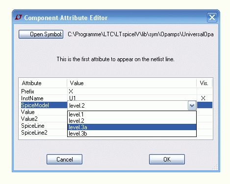Schau dir mal deine Datei an die du als erstes angehängt hast. Da stehen diese "komischen" Werte(Texte) drin. PS2801C-1.asy Es gibt drei Arten von Subcircuit-Symbolen plus eine Untervariante. Spezifisches Symbol: LT1013 Universelles Symbol: opamp2 Eine Unterart des universellen Symbols hat zusätzlich den Filenamen des subcircuits im Attribute "Modelfile". Drop-down-selection Symbol: UniversalOpamp2 Im Anhang ist meine Beschreibung die ich vor Jahren in die Yahoo group eingestellt habe.