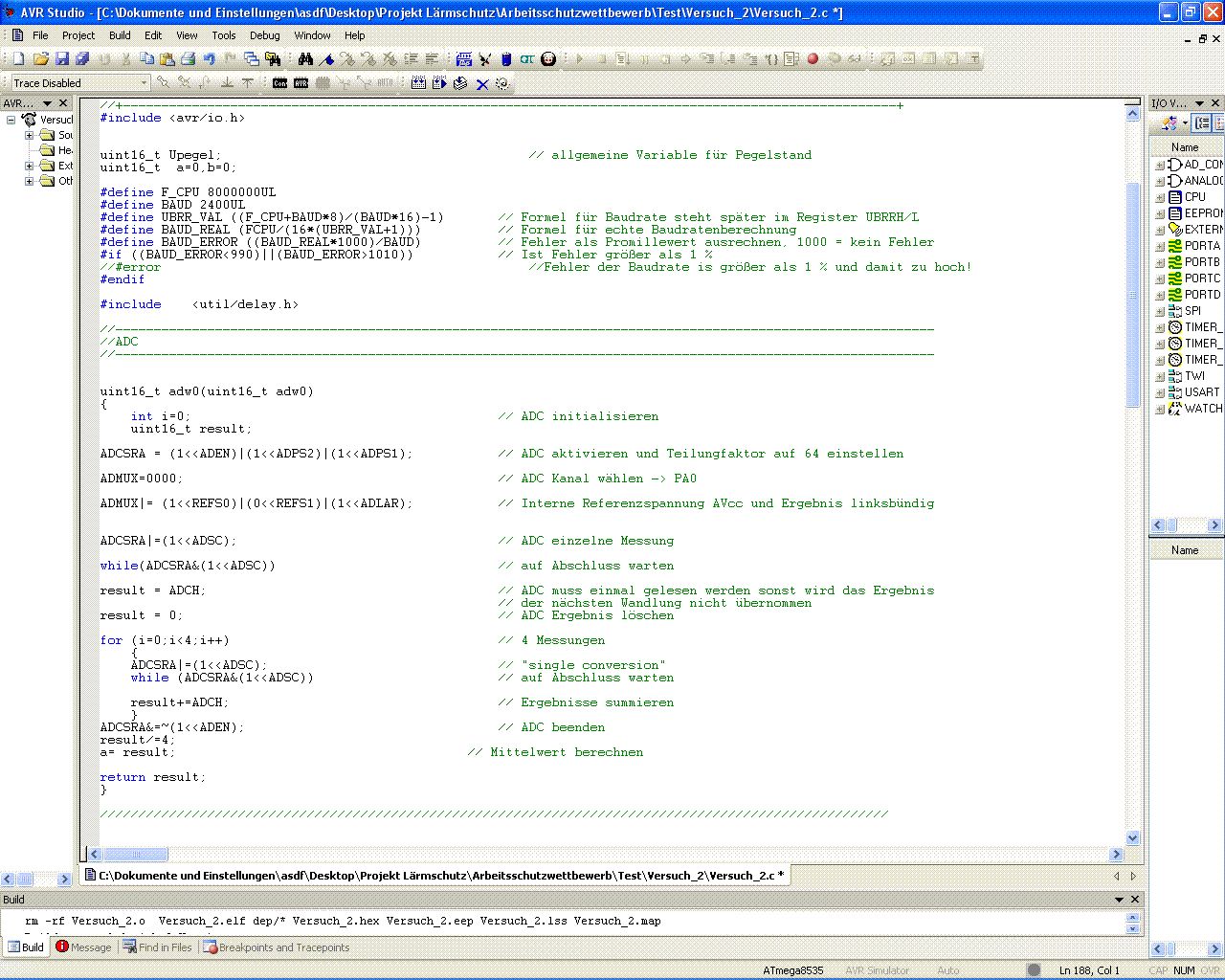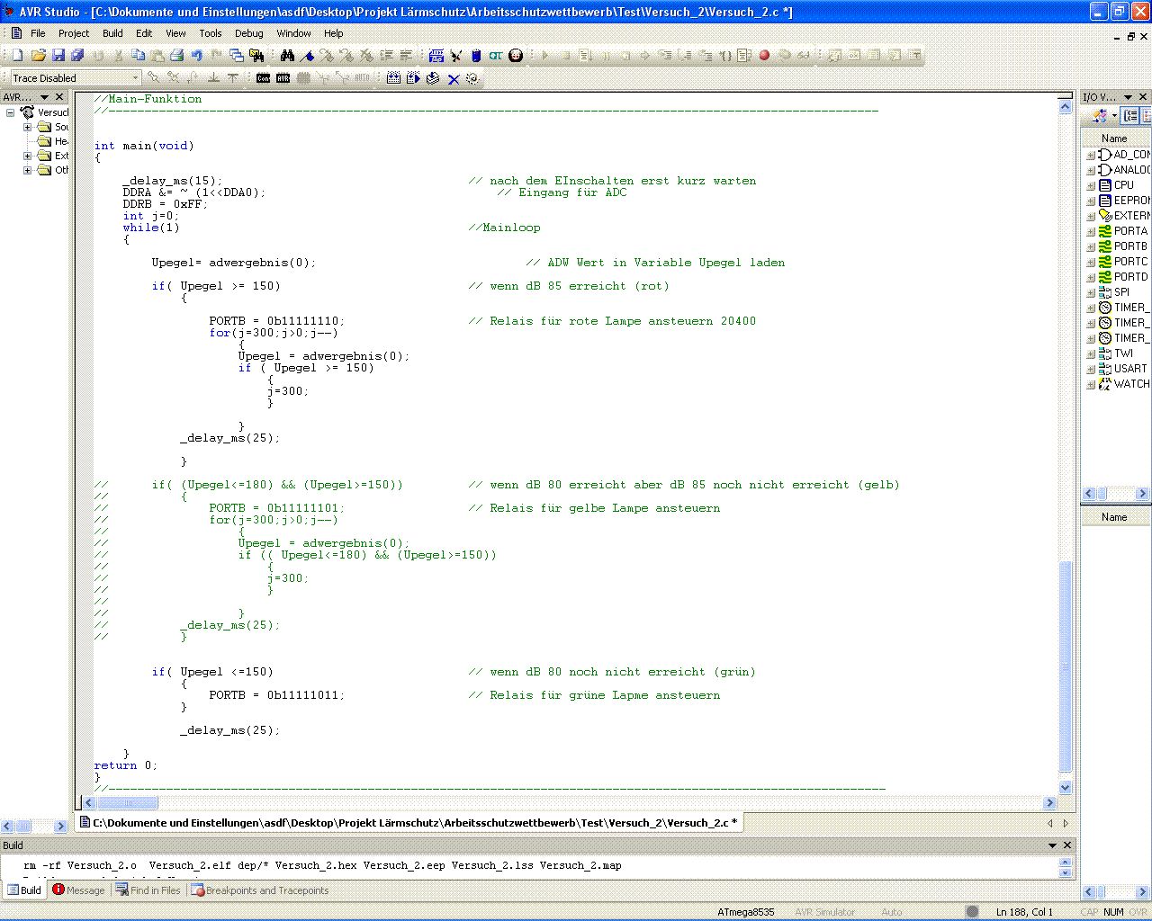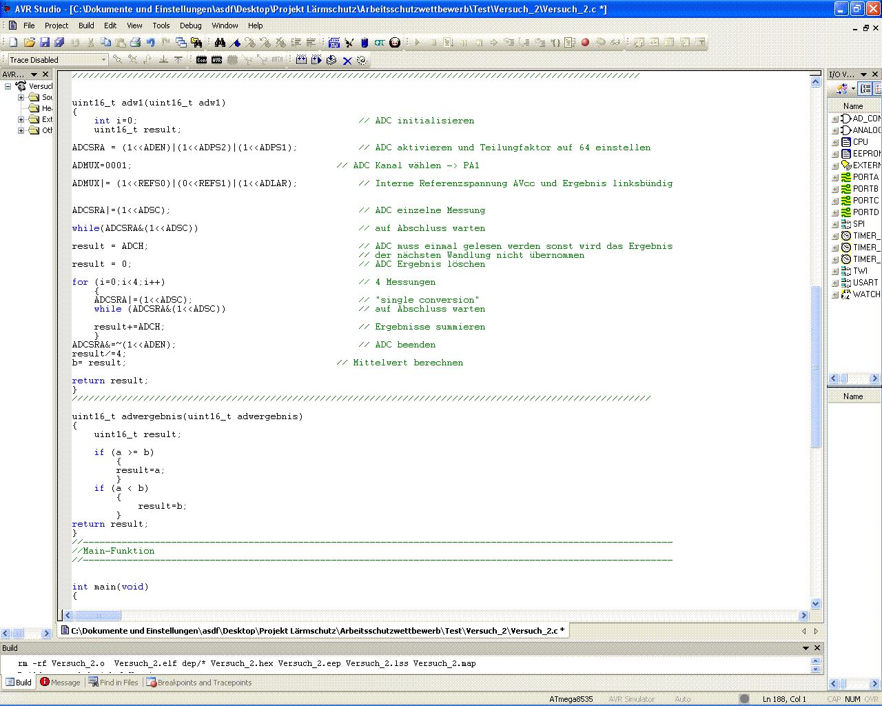 Hallo, ich habe Probleme mit meinem C-Programm. Ich möchte das zwei analoge Signale ziwschen 0V und 5V am AD-Wandler sowohl an Kanal_0 als auch an Kanal_1 anliegen und diese dann mit einander verglichen werden. Das größere Ergebnis soll im Hauptprogramm dann an Ports ausgegeben werden. Das Gerät dient im Endeffekt als Lautstärkeüberwachung. Es soll ab einer bestimmten Lautstärke an einem der beiden Mikrofone eine Rote Ampel angesteuer werden. Dann soll ein Zähler gestartet werden der sich um eins verringert wenn die Lautstärke wieder absinkt und wieder auf den Anfangswert setzt wenn die Lautstärke über einem bestimmten Wert ist. Somit soll die Ampel bei Lärm immer min Minuten leuchten. Mir ist bewusst das die Werte der Wartezeit und die dB Werte noch nicht stimmen aber die werde ich auch erst einstellen wenn das Programm sonst soweit richtig arbeitet. Ich würde mich freuen wenn ihr mir weiter helfen könntet indem ihr mir sagt ob ich den AD-Wandler richtig initialisiert habe und ob das Programm zur Erfassung der ADW-Werte bzw der Vergleich der beiden ADW-Kanäle richtig ist. Tut mir leid wenn ich viele Fehler drin hab, aber ich bin echt noch Anfänger und steh gerade sogar bei sowas einfachem wie dem Variablen Vergleich auf dem Schlauch. Ich bedanke mich schonmal bei euch.