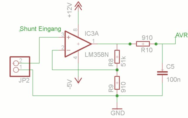 Hallo, Ich möchte mithilfe eines Shunts(70mV max) einen Strom messen und ihn an meinem ATmega8 auslesen. Der Shunt liegt an Masse. Da hab ich mir gedacht, ich nehme einfach den beliebten LM358 als nichtinvertierter Verstärker und pack noch einen Low-pass-filter hintendran. Verstärkungsfaktor sollte eigentlich bei etwa 57 liegen, ist bei niedrigen Eingangsspannnungs allerdings deutlich weniger. gemessen habe ich: Alles in mV: Uin Uout v 5 62 12 15 648 42 30 1502 50 50 2630 52 70 3780 54 Warum ist die Verstärkung erst bei "hoher" Shuntspannung zufriedenstellend?
