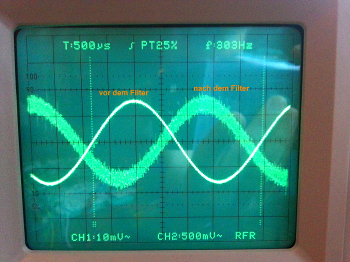 So, ich habe mich nun wieder diesem Projekt gewidmet. Wie bereits erwähnt, habe ich jetzt eine OP-Schaltung (Butterworth-Filter), die mir sehr gut alle hohen Töne bis auf den reinen Bass herausfiltert. So kann ich gezielt die Lautstärke des Basses varrieren. Da ich jetzt aber nicht nur den tollen Bass sondern alle Frequenzen meiner Musik genießen möchte, muss ich nun das verstärkte Basssignal und die restlichen Frequenzen irgendwie zusammenführen. Dabei dachte ich mir, ich schalte einfach noch einen Summierverstärker dahinter, welcher mir das Basssignal und das unveränderte Signal vom mp3-Player zusammenführt. Doch dabei gibt es ein Problem: Das Signal nach dem Butterworthfilter ist phasenverschoben zum Signal vor dem Filter. Bei 300Hz sind es grob geschätzt 150°, was heißt, dass sich beide Signale teilweise auslöschen, wenn ich versuchen würde, Eingangs- und Ausgangssignal zu addieren. Die Phasenverschiebung wird übrigens mit sinkender Frequenz immer kleiner! Ein Oszillogramm dazu ist im Anhang (Signal vor dem Filter, also das mp3-Signal, und nach dem Filter der Bass). Jetzt meine Frage: Wie führe ich beide Signale wieder zusammen, ohne irgendwelche Auslöschungen zu haben? Oder gibt es noch andere Filter, die keine Phasenverschiebung aufweisen?