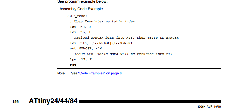Hi Leute, Ich bekomme diesen Assebler Schnippsel nicht zum laufen. Ich benutze AVR Studio 6. Und will die Device Signiture Auslesen so wie auf Seite 156 im Tiny 24 Handbuch beschrieben. Ich habe nach viel suchen beispiele Gefunden wie ich denn Code Zeile für Zeile einfüge. Allerdings bekomme ich dauernd fehlermeldungen das die defines wie ZH z.B. nicht definierst sind. Ich habe #include <avr/interrupt.h> #include <avr/io.h> #include <avr/common.h> #include <avr/sfr_defs.h> #include <stdint.h> Eingebunden meckert aber immer noch. Hat jemand von euch ein Beispiel wie aus dem Code eine funktion mache die mir den Wert dann zurück gibt. Sowas wie DeviceSigniture = Get_Device_Signiture(); Danke im Vorraus. Shalom