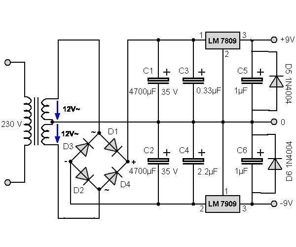 > Das ist die Standardschaltung. Nicht ganz. Wie schon geschrieben braucht man einen 2 * 12V~ Trafo der 1.6A pro Wicklung liefern kann wenn man dauerhadt 2 mal 1A ziehen will (oder allgemein einen Trafo mit dem 1.6-fachen Strom den man dauerhaft braucht), und die Dioden sind anderswo besser verbaut, siehe Bild, und die Sicherungen nicht wirklich nötig (die Spannungsregler haben schon eine Kurzschlussbegrenzung). > Gibt es das auch fertig? Auf 9V einstellbar: http://www.ebay.de/itm/Symmetrisches-Netzteil-fur-Preamp-CD-Player-etc-/160874560655?pt=DE_TV_Video_Audio_Sonstige&hash=item2574defc8f
