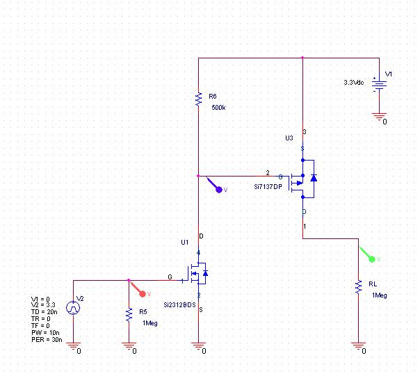 Auf Grund des Ids_off Leckstromes des ersten Mosfets und des Igs Leckstromes des zweiten Mosfets sind 500kOhm viel zu hoch egal wie schnell du schalten willst. So etwas gibt allerdings das Simulationsmodell nicht her. Da musst du ins Datenblatt schauen.