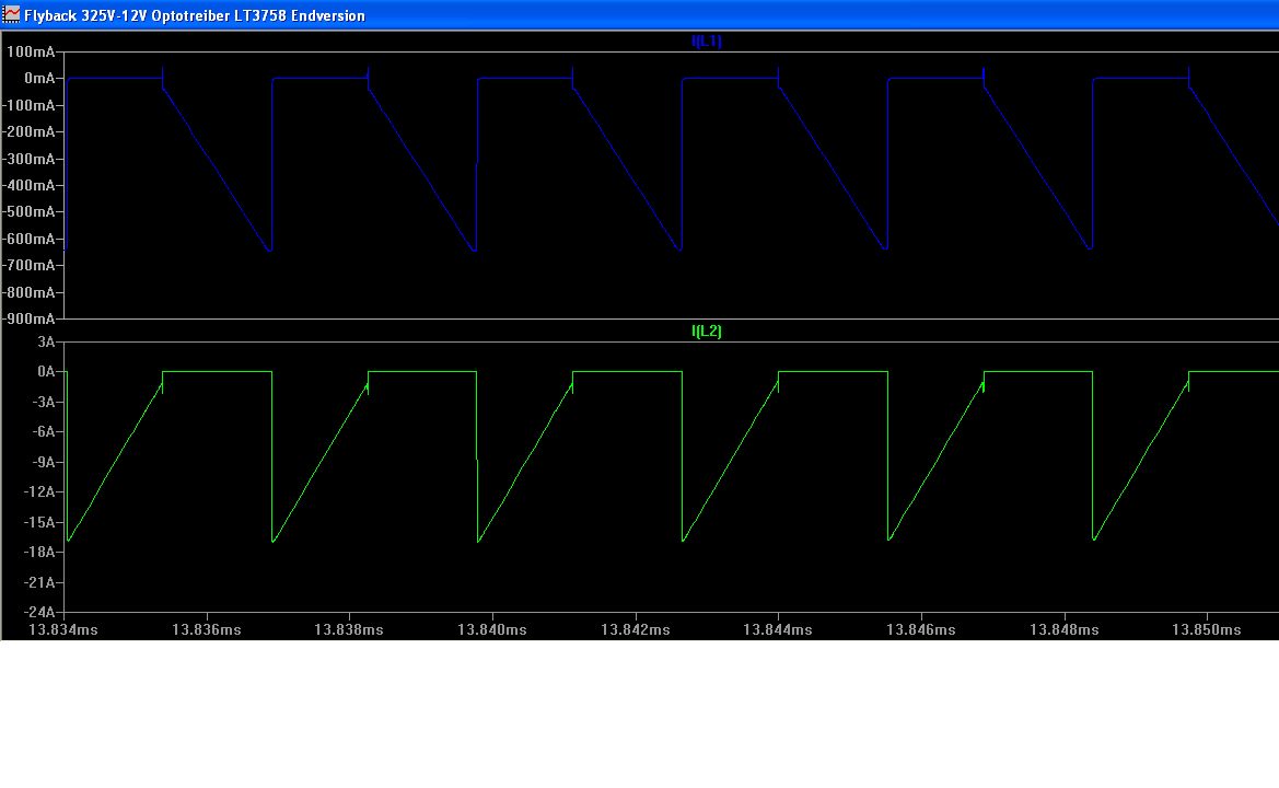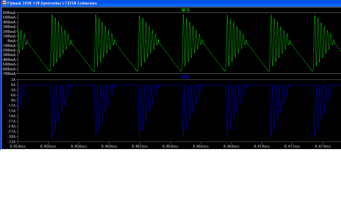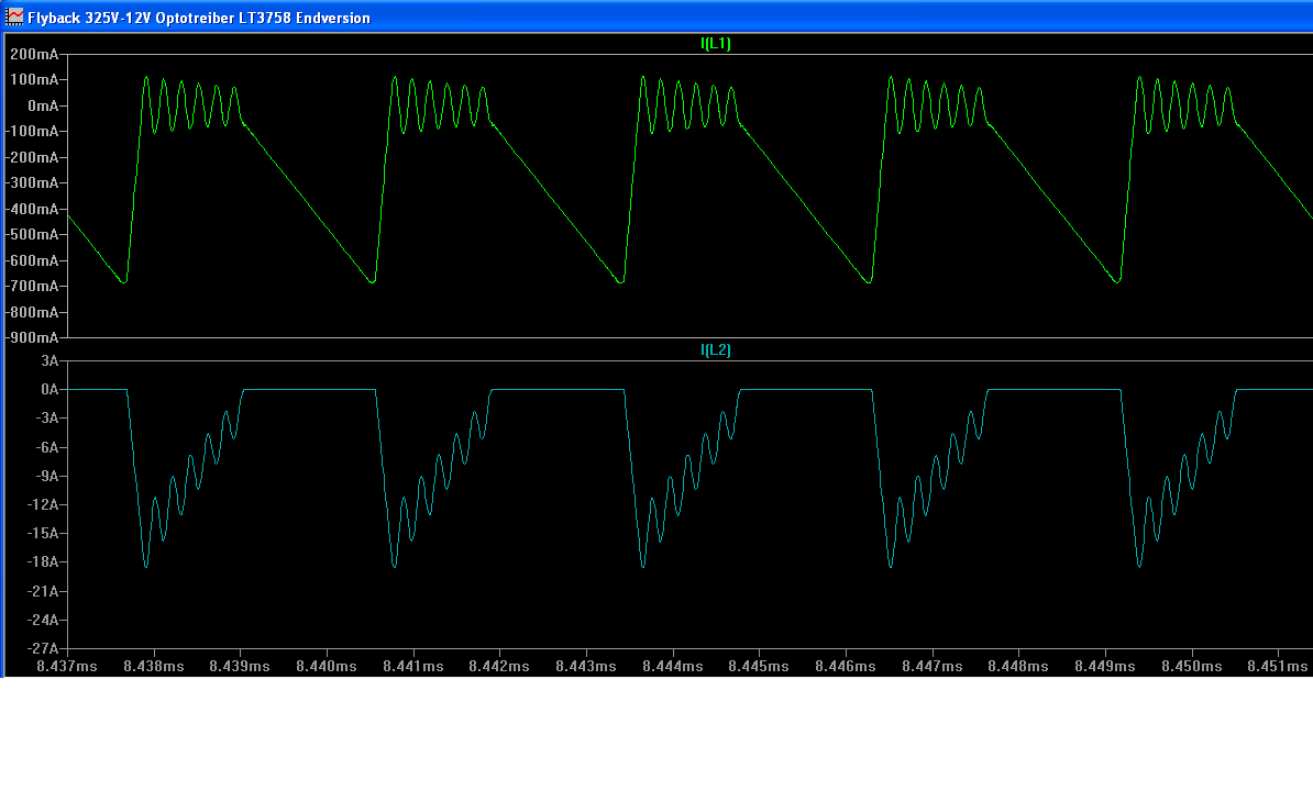 MaWin schrieb: > Mehr in: > Pressman "Switchmode power supply handbook" Kapitel 3.3, > was der Snubber zur Entlastung des Schalttransistors beiträgt, > zur Reduktion von dV/dt und > was er dem EMI Verhalten der Schaltung nützt. Nach diesem Buch hab ich jetzt mal gesucht, als PDF scheint es das aber nicht kostenlos im Internet zu geben. Auch die Bibliothek meiner Hochschule hat es nicht im Programm. Deswegen bringt mich das jetzt nicht wirklich weiter. MaWin schrieb: > Die MUR460 ist daher unpassend. Da hast du recht. Im Datenblatt des LT3758 steht, dass die Reverse Voltage der Snubberdiode mindestens so groß sein soll, wie die Summe der Snubber-Kondensator-Spannung und der maximalen Eingangsspannung. Da mein berechneter Wert der Snubber-Kondensator-Spannung 731.2V ist, würde das heißen, dass die maximale Rückwärtsspannung der Diode mindestens rund 1050V sein muss. Ich hab jetzt mal bei Onsemi gesucht, die haben aber nur Dioden bis 1000V Sperrspannung. Drum hab ich jetzt mal die DMRA4007T3 genommen. Die Werte für Snubber-Widerstand und Kondensator hab ich gleich gelassen, am Ergebnis hat sich aber nichts geändert. Eigentlich machen meine Stromverläufe ja auch zum Teil Sinn. Der Strom in der Primärspule steigt zuerst linear an. Dann sperrt der MOSFET. Dann klingt der Primärstrom, welcher nun über die Snubber-Diode fließt, schwingend ab auf 0 Ampere, wobei das die ganze taus-Phase dauert. Das schwingende Abklingen des Primärstroms wird über den Trafo auf die Sekundärseite übertragen, weshalb dem linearen Verlauf des Sekundärstroms das Schwingen überlagert ist. Was mir aber noch ein wenig seltsam vorkommt ist, dass der Primärstrom beim Abklingen zum Teil rückwärts fließt, was heißt, dass er den Weg über den MOSFET nimmt. Das liegt entweder daran, dass das Gate-Signal in der Aus-Phase nicht 0V hat, sondern auch schwingt, mit einer maximalen Amplitude von 0.9V. Oder es liegt daran, dass der Snubber noch nicht wirklich gut arbeitet und Vds,max momentan noch bei 916V liegt, also über den 800V welche der MOSFET maximal sperren kann. Da man in den meisten Büchern und im Internet immer nur idealisierte Stromverläufe zu Sperrwandlern, also ohne Snubber, findet, wäre es gut wenn ich Unterstützung bzw Beratung aus dem Forum hätte. Gruß