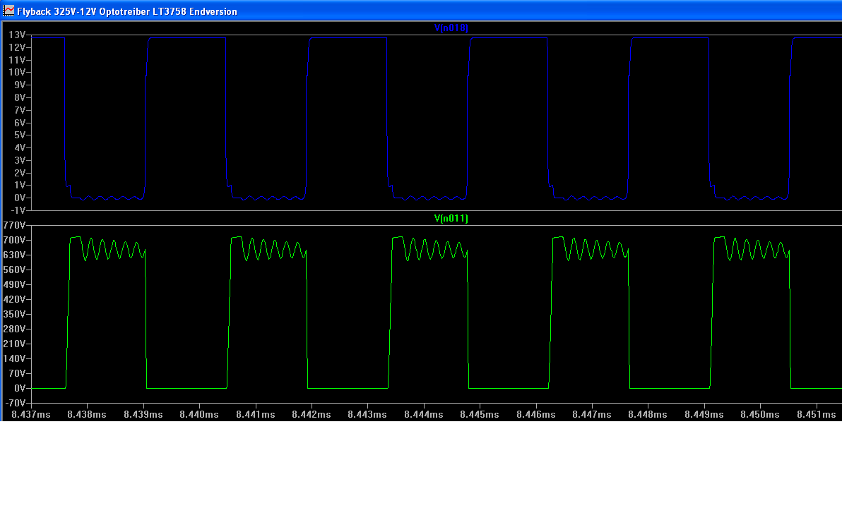 Jetzt habe ich mal nochmal die Standard-Snubber-Lösung mit R=20k und C=10nF probiert und beim genaueren Betrachten festgestellt, dass der Snubber nun deutlich besser arbeitet. Vds,max ist bei Aufstarten und 725V und im stationären Betrieb 715V. Auch die Schwingungen in den Strömen sind nun mit deutlich kleinerer Amplitude. Außerdem ist die Gate-Source-Spannung nun im ausgeschalteten Zustand schöner. Im Anhang sind die Bilder der wichtigen Verläufe. V(n018) ist Vgs und V(n011) ist Vds. Jetzt heißt es entweder Try-And-Error spielen oder es sei denn, jemand liefert mir ne Formel zur rechnerischen Auslegung des Snubbers. Gruß