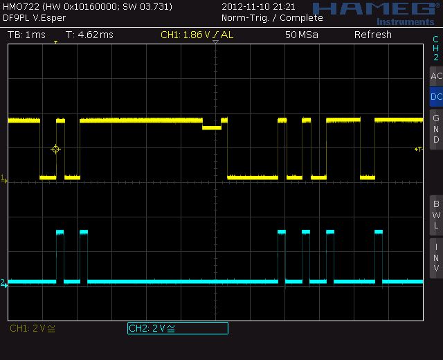 Anbei zwei Oszillogramme des GPIB (beim Sammeln der einzelnen Geräteadressen), eines, das DAV und NRFD zeigt (leider habe ich kein 4-Ch-Oszi) und eines, was den DAV mit dem NDAC zeigt. Sieht doch eigentlich richtig aus, oder? Auch die Pegel sollten stimmen...