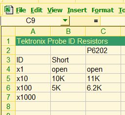 Die einfache Art der Tek Probe ID an den BNC Steckern mache ich mir immer selbst. Ein stückchen Federblech am BNC Stecker anlöten und an der Spitze zwei passende SMD Widerstände (Rücken an Rücken zur beseren Stabilität und an der Spitze ein kleiner Lötzinntropfen als Scheuerschutz) - fertisch. Das sieht vielleicht abenteuerlich aus, ist aber seit über 6 Jahern bei mir im Einsatz ohne das was kaputtgegangen ist. Den exakten Widerstandswert kann man einfach probeweise ermitteln in dem man BNC GND und Datenring mit einem Trimmer überbrückt - die Werte sind aber meist recht unkritisch.