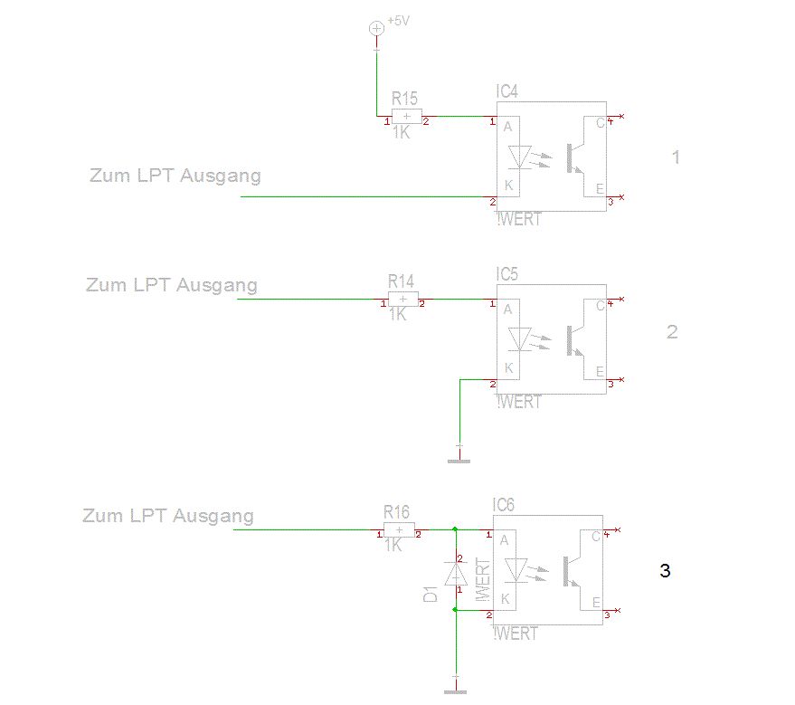 Matthias schrieb nur, dass es vom Rechner kommt, nicht vom Port selbst. Der hat gar keine explizite +5V-Leitung. Die +5V musst Du also direkt vom Netzteil oder vielleicht einem USB-Anschluss holen. Galvanische Trennung ist durchaus sinnvoll und erspart einem aufwändige Fehlersuche, da die Leitungslängen bei Maschinen nicht gerade klein sind. Auch mit Schirmung sammelt sich da viel Müll an (z.B. bei der Zündung eines Plasmaschneidkopfs). Das möchte man nicht im Rechner haben :-) Chris D.