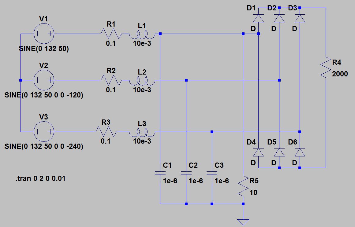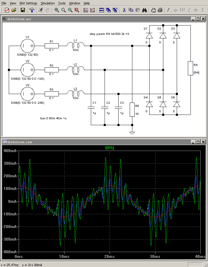 Naja. Ist das nicht das Ziel der simulationen sowas herauszufinden? Wir haben 132V Spannung gegen den Sternpunkt, welcher nicht herausgefuehrt ist. Den wuerd ich herausfuehren und als Null benennen. Dann haben wir zwischen den Phasen 10//1uF & 1uF & 1uF. Der Gleichrichter ist erst mal nicht interessant. Ja, dann die Maschen- & Knotengleichungen aufstellen und loesen. Ja, die Phasen sind wichtig.