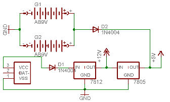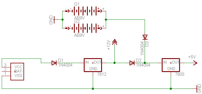 Hi, nach dem 7812 ne Diode in Reihe zum 7805, da die 9V der Batterie über eine Diode zuführen. Mfg Sascha