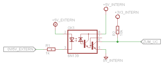Hallo zusammen, wie schon in meiner Überschrift erwähnt, bin ich absoluter Anfänger in Sachen Optokoppler... Am Eingang habe ich ein 5V Signal und einen Rv von 1kOhm. Den Ausgang habe ich wie folgt geschaltet: Pin8: 3,3V vom Spannungsregler Pin6&7: nicht belegt Pin5: "pull-up" mit 1kOhm zur Masse und 2kOhm i.n Reihe zum Eingang des µC. Leider komme ich nur auf etwa 1,4V am µC-Eingang. Wenn ich jetzt die 1kOhm am Ausgang gegen Masse erhöhe wird die abzutastende rechteckform sehr flach und die Spannug erhöht sich nur geringfügig. Habe ich in meiner Beschaltung etwas vergessen? Danke für Eure Hilfe. Grüße Matze