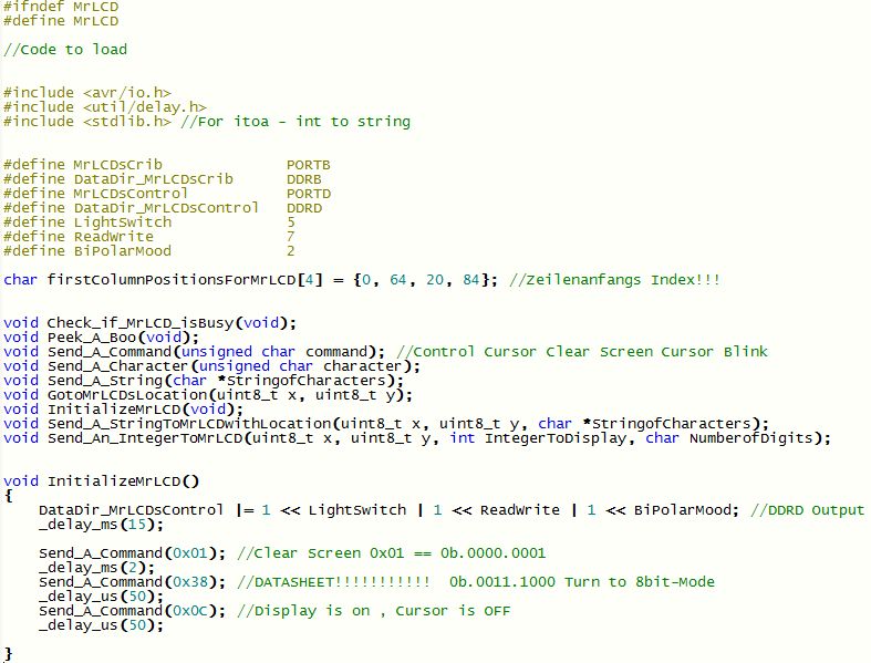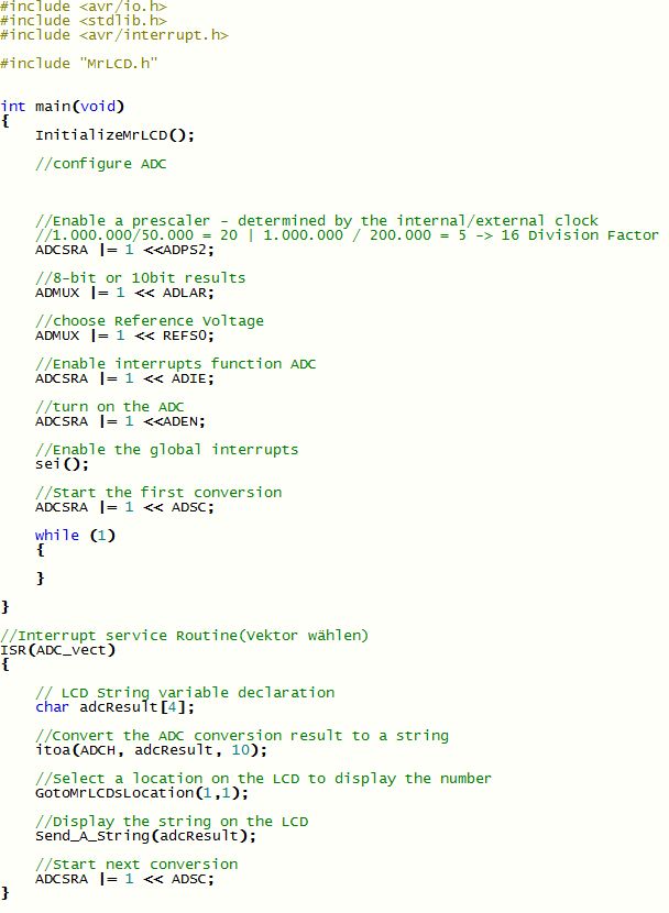 Hallo mal wieder, ich arbeite mich gerade in die Welt der Mikrocontroller ein und arbeite ein Tutorial ab. In diesem Tutorial soll eine Potentiometerstellung über den ADC (ADC0 - PIN40) auf ein Display angezeigt werden. Gibt es einen Grund dafür das ich den PortC nicht nutzen kann wenn ich ADC nutzte? Das Display ist zwar an aber das Bild ist glaub ich sehr schwach bzw eigentlich weiß ich nicht genau was das Problem ist, es leuchtet auf jeden Fall nur erscheint keine Zahl oder Zeichen. Im Tutorial ist das LCD an PortB angeschlossen, allerdings habe ich es an PortC angeschlossen damit ich nicht bei jedem neu programmieren des ATMega das LCD abklemmen muss (SPI-Pins). Das Display war bei mir vorher auch schon für andere Tutorials an Port C angeschlossen und hat dort funktioniert, erst bei der Nutzung von ADC funktionierte es nicht mehr. Von daher sollte von der Verschaltung kein Problem herkommen, ich habe diese auch mehrere male komplett neu gelegt. Beim Anschluß des LCDs an PortB funktioniert die Anzeige. Man könnte sagen dann ist ja alles ok, aber dennoch wundere ich mich wieso es an PortC nicht funktiniert hat. Vielleicht gibt es ja einen Zusammenhang?!