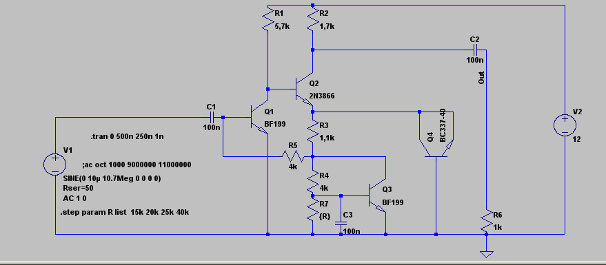 Ich habe mal vor über 10 Jahren von einem Litauer eine Kiste mit unterschiedlichen russischen Ics geschenkt bekommen, zusammen mit einem Datenbuch. Da sind teilweise recht interessante Sachen drin, z.B. ICs im TO99 Gehäuse, kleine Vorverstärker auch Zeug ähnlich CA3005 usw.. Ich habe gerade einen IC am Wickel der sich K1UB221W nennt (К1УБ221В) oder aber acuh K122UB1W (К122УБ1В). Das Ding nennt sich Videoverstärker und ich mache mir gerade Gedanken darüber ob es als ZF Verstärker für eine 10,7 bzw. 18Mhz 1.ZF eines Kurzwellenempfängers brauchbar ist... Abgesehen davon das mit einem К231US1 auch ein Chip mit Videoverstärker bezeichnet ist für den eine Grenzfrequenz von 50 bzw. 100Khz angegeben wird und ich mich frage was das soll, habe ich versucht diesen IC mal mit LTSpice zu simulieren. Q4 dürfte ja nichts weiter als eine Diode in Sperrrichtung darstellen, aber je nach ausgewähltem Transistor unterscheidet sich doch stark was da hinten heraus kommt. Was macht das Ding? R7 ist extern, damit gedachte ich eine AGC zu realisieren, der Rest bsi auf die Quellen und die Kondensatoren befindet sich im IC. Ich weiß, ohne sinnvolle Daten der integrierten Transistoren kommt da im Wesentlichen irgendwas heraus... Hat Jemand eine Meinung dazu? Gruß, Holm