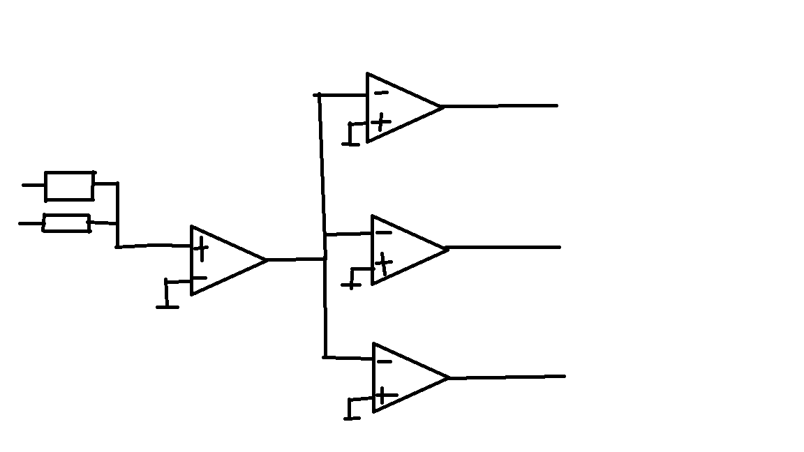 SO nicht, SO arbeiten deine OpAmps als Komparatoren die nur "Volle Spannung" oder "volle negative Spannugn2 ausgeben. Schau dir erst mal Grundschlatungen für Operationsverstärker an, z.B. nicht-invertierend mal 10 oder invertierend mal 20. Dabei steht, daß es natürlich auch geht, mehr als einen Verstärkereingang an den Ausgang eines vorherigen Verstärkers anzuschliessen.