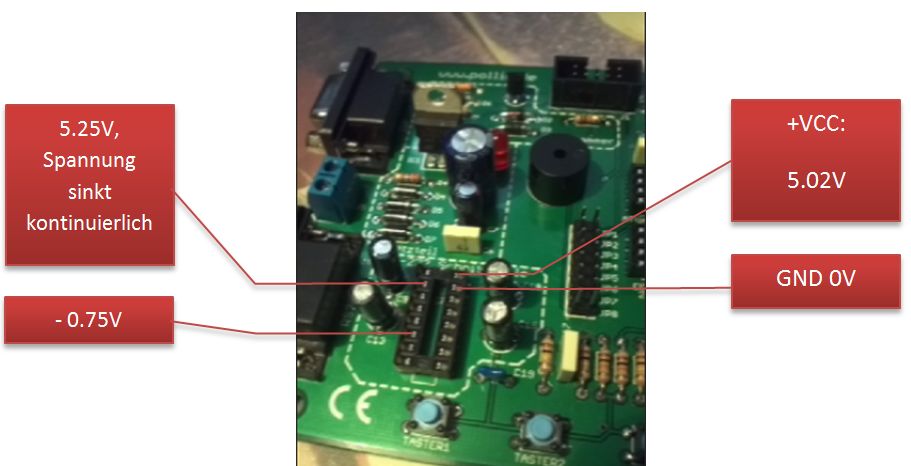 Hallo, ja, im Nachhinein bin ich natürlich auch schlauer. ;-) Zuerst kann ich aber etwas Positives vermelden: Mein Programmer funktioniert wieder. Falls jemand mal ein ähnliches Problem haben sollte: Das Teil verweigert immer den Dienst, wenn ich es in das Frontpanel meines Rechners stecke... Und weil ich ohnehin etwas durch den Wind war, bin ich nicht auf die Idee gekommen, den Programmer mal hinten einzustecken. Und schon wird er erkannt. Damit halbiert sich auch mein Lehrgeld schonmal auf die Hälfte. :-D Zur Temperatur: Wenn ich den MAX232 weglasse, bleibt die Temperatur des 7805 etwa handwarm. Nicht so kalt wie wenn ich das ganze ausstecke, aber eben im Rahmen, denke ich. Nun werde ich noch einen Gleichrichter rauskramen und mal den Stromfluss messen. Die Spannung(en) habe ich jetzt auch gemessen: Das Bild im Anhang zeigt (Ich habe alles gegen den Pol gemessen, den ich als GND identifiziert habe), dass die Versorgungsspannung am dafür vorgesehenen Pin nicht zu hoch ist. Am oberen Pin links sinkt bei der Messung die Spannung immer weiter. Wenn ich das richtig sehe ist dieser Pin mit einem Elko verbunden, und dieser geht danach direkt an den Pin für die Versorgungsspannung des MAX232. Dass ich also den Kondensator aufladen kann, zeigt, wie ich das sehe, dass hier wohl kein Verdrahtungsfehler vorliegt, sehe ich das richtig? Auffallend ist aber der linke untere Pin. Gegen GND liegt hier eine neg. Spannung an. Der Kondensator liegt mit dem +-Beinchen an der Massefläche und auf der anderen Seite direkt an besagtem Pin. Wie lädt sich dieser dann auf, sodass hier ein Potentialunterschied herrschen kann? Vielen Dank nochmal! Echt klasse, wie einem hier geholfen wird (obwohl mein Problem sehr... ich sag mal, auf menschliche Dummheit gewachsen ist...). Gruß Ralph