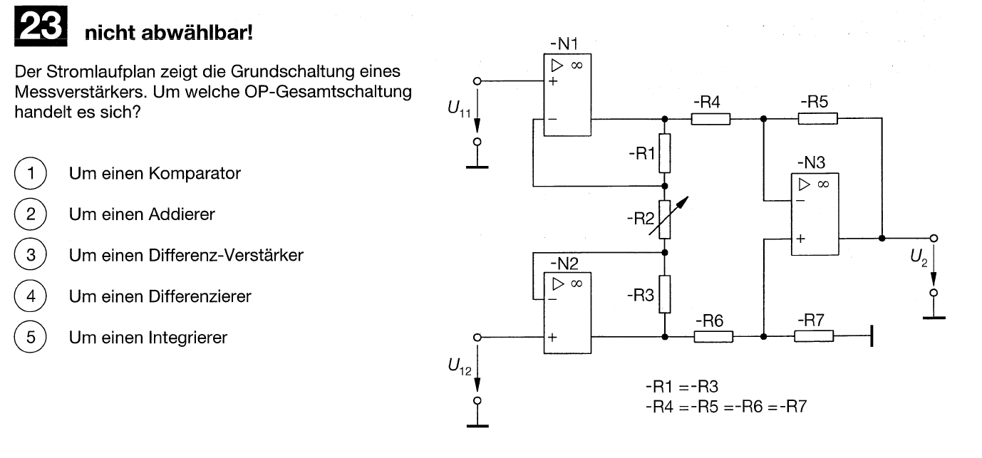 Hallo, wenn du die Schaltung nicht kennst, kannst du das Ausschlussverfahren anwenden: - Integrierer kann es nicht sein, da muss ein Kondensator in der Schaltung sein - dito Differenzierer - Komperator ist ein OP ohne Gegenkopplung Bleibt also noch Addierer oder Differenzverstärker. Bei einm Addierer muss es einen Punkt geben, an dem sich die Ströme der einzelnen Eingänge addieren können. Und wenn du nur den rechten Teil der Schaltung betrachtest (R4 bis R7, N3) dann siehst du den Differenzverstärker. Die restlichen Bauteile machen aus dem Differenzverstärker einen Instrumentenverstärker. Der Vorteil der Schaltung ist, dass die Eingangsimpedanzen sehr hoch sind und somit das Messobjekt möglichst wenig belastet wird. Grüße, Florian