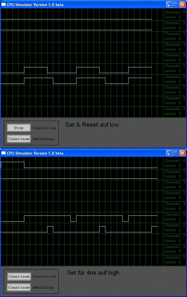 Hallo zusammen, ich versuche gerade mir ein Simulationsprogramm zu schreiben, doch ich habe gerade ein Problem: Ich habe jetzt versucht ein RS-FlipFlop zu simulieren, doch habe ich nun komische Signalverläufe auf dem Bildschirm: 1) Wenn R und S von Anfang an low sind, dann schwingen die Ausgänge einfach vor sich hin. Wenn ich z.B. zu erst reset auf high setze und dan beide low, dann sind die Ausgänge stabil! 2) Wenn ich R oder S nicht mindestens so lang auf high lege, wie die Gatterlaufzeit, bei meinen NOR-Gattern 4ns, dann sind die Ausgänge auch mit einzenlnen high oder low "Spitzen" versehen. Meine Frage nun: Ist das ein normales Verhalten von RS-FlipFlop´s oder muss das an einem Programmfehler meinerseits liegen. Hab noch 1 Bild mit den 2 Verläufen angehängt. Channel 1 ist SET Channel 2 ist Reset Channel 6 & 7 die Ausgänge Gruß Markus