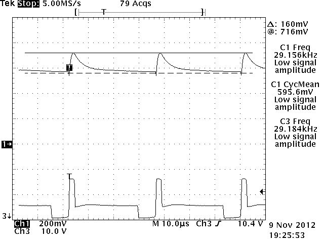 >weil die Kondensatoren den dynamischen Strom der LEDs >(Raumladungszonenkapazität) nicht auffangen und dort Leckstrom >versickert... Irgendwie verstehe ich noch nicht so genau deinen Hinweis. Heisst das, dass ein überlagerter AC Ripple auf dem LED Strom schlecht in Photonen umgesetzt wird und stattdessen als Leckstrom nur unnütz Wärme produziert? Ich dachte immer dass innerhalb des zulässigen min/max LED Stroms die Lichtstärkekurven sowohl für DC als auch AC gelten. Oder kommt dein Hinweis auf eine Glättunsspule vielleicht daher dass du das kleine Oszidiagramm der Ausgangsspannung in obigem Schaltplan als DC Spannungsverlauf interpretierst und dann wegen des ständigen unterschreitens des min. LED Stroms die LED stresst? Im Anhang nochmal im Detail der Stromverlauf in den LEDs gemessen über den Shuntwiderstand R2=6.2Ohm sowie der Spannungsverlauf am Drain des IRLML2502. Der LED Strom schwankt demnach zwichen 89 und 114mA, sollte also innerhalb des erlaubten Bereichs von 30-250mA für die LUW_CN5M-3 liegen.