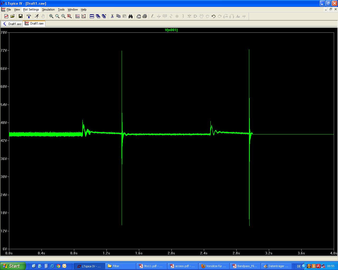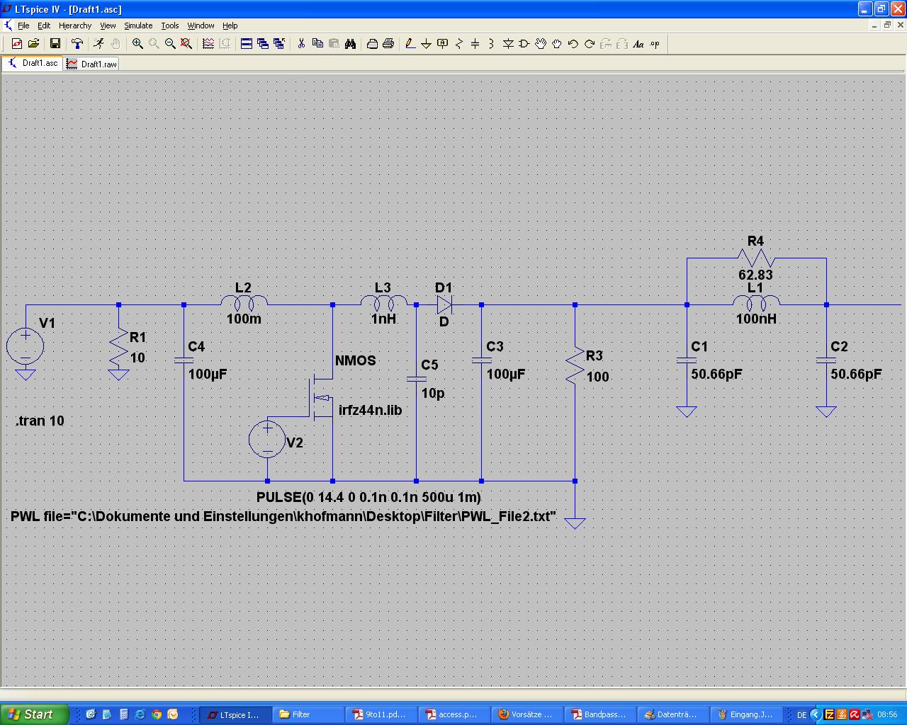 Guten Tag Mikrocontroller Community, Ich habe schon öfters mal hier reingeschaut und die passende Hilfe gefunden, doch bei meinem jetzigen Problem habe ich leider noch nichts hilfreiches gefunden. Meine Problematik ist folgendes: Meine Aufgabe besteht darin, einen PI-Filter an einen beliebigen DC/DC Wandler anzupassen, dass heißt ich bekomme einen DC/DC Wandler und muss dann die Werte für den Pi-Filter ändern. Momentan versuche ich das Problem mit LTSpice zu analysieren. Im Anhang habe ich meine Eingangsspannung, die auch Störungen (EMV) beinhaltet. Desweiteren habe ich im Anhang die Kompletteschaltung, also Eingangssignal->DC/DC Wandler(Boost)->Pi-Filter. Mein Problem ist, dass ich einfach nicht verstehe wie ich die Werte am Pi-Filter ändern muss um eine möglichst geringe abweichung (kleines Ripple) zu erhalten. Egal wie ich den Wert ändere die Spannung vor dem Filter ist gleich der Spannung nach dem Filter. Ich habe die verschiedenen Formeln für Grenzfrequenz usw. doch komme ich einfach nicht dahinter. Mir ist klar das der DC/DC Wandler gewisse Werte vorgibt um den PI-Filter zu berechnen, doch leider bin ich ein wenig verwirrt. Ich hoffe mir kann einer erklären wie ich den PI-Filter einzustellen habe und warum. Ich danke schonmal für eure Hilfe. MfG SheeX