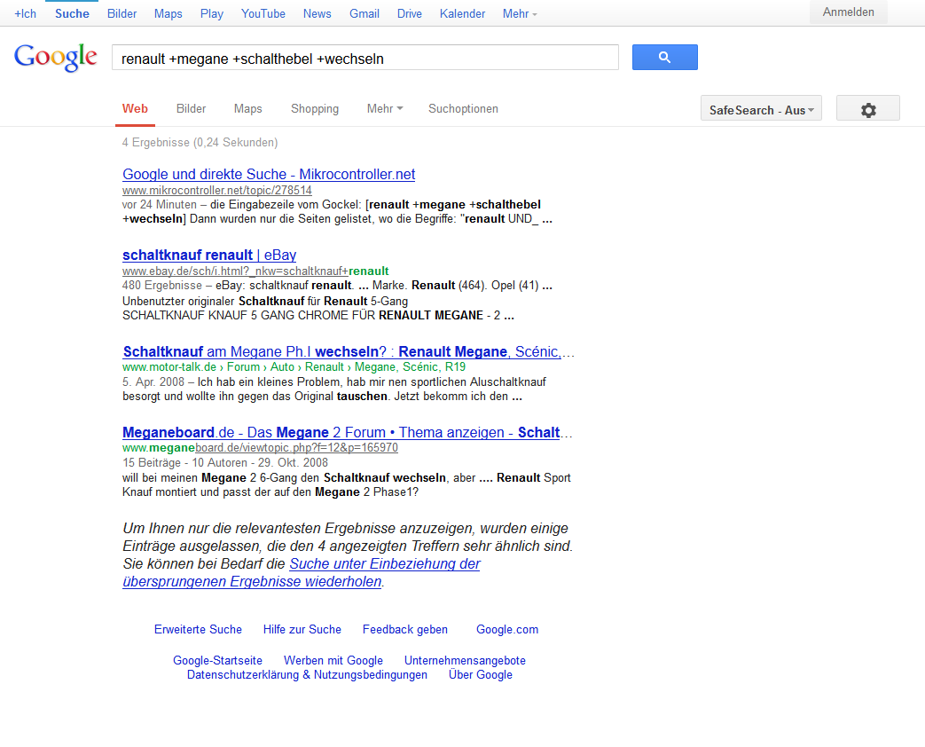 Stevko R. schrieb: > Wenn man diesen Suchstring: > [renault +megane +schalthebel +wechseln] > eingegeben hatte, monierte der Gockel die "+" und enfernte diese in dem > Suchvorschlag. Ist bei mir nicht so, siehe Screenshot. Die exakte URL ist: http://www.google.de/search?q=renault+%2Bmegane+%2Bschalthebel+%2Bwechseln&ie=utf-8&oe=utf-8&hl=de&aq=t&safe=off&client=firefox&rls=org.mozilla:de:official > In der neusten Version ersetzt der Gockle die Schlagwörter durch eigene > Interpretationen. > [renault megane schalthebel wechseln] > Die ersten Einträge sind für einen "Schaltknauf-Wechsel", doch das habe > ich nicht gesucht. Ziel war der Schalthebel! Das ist mir auch schon negativ aufgefallen. Allerdings kann man das umgehen, wenn man das Wort in Gänsefüßchen einschließt: [renault megane "schalthebel" wechseln] http://www.google.de/search?q=renault+megane+%22schalthebel%22+wechseln&ie=utf-8&oe=utf-8&hl=de&aq=t&safe=off&client=firefox&rls=org.mozilla:de:official