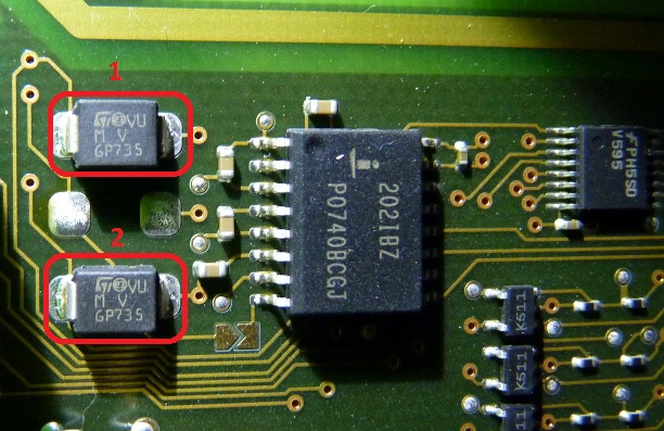 Schutzdioden für die Datenleitung ( Überspannungsschutz ) Da den Dioden eine Kathodenmarkierung fehlt, sind es wohl bipolare Typen. Welche Durchbruchspannung die haben musst du evtl per Experiment ermitteln. Labornetzteil mit Strombegrenzung auf Imax ca. 10mA einstellen, Diode zwischen + und - anklemmen und Spannung am Netzteil langsam hochfahren ( bei 0V beginnend ). ab irgendeiner Spannung fliessen "plötzlich" die 10mA. Das muss auch mit umgepolter Diode funktionieren, wenn´s bipolare sind. P.S.: die Dioden musst du vorher natürlich auslöten...