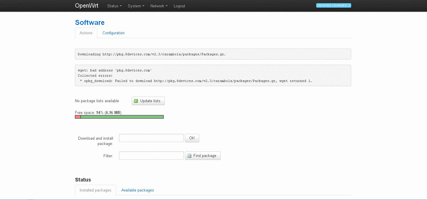 Hallo, an einen XP-Rechner, der an einer Fritz-Box hängt (WLAN), ist ein OpenWrt-System (Carambola) via Netzerkkabel angeschlossen. Vom Browser (FireFox) kann ich ohne Problme auf das OpenWrt-System zugreifen (Adresse: http://192.168.0.104). Der Versuch zusätzliche Pakete auf dem OpenWrt-System zu installieren schlägt jedoch fehl (siehe Bild im Anhang). Was muss ich tun, damit das OpenWrt-System Zugriff auf das Internet bekommt? mfg Siegfried