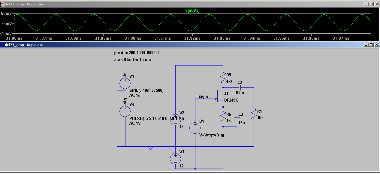 Ich habe einen DCF77 Vorverstärker mit BF245C in Source-Schaltung (Drain mit 4k7 an +12V, Source mit 1k parallel 47nF an -12V). Wenn ich die Antenne richtig ausrichte kann man das DCF-Signal am Oszilloskop sehen (Spitzenwertabtastung). Wenn ich die Antenne allerdings falsch ausgerichtet habe schwingt die Schaltung mit hoher Amplitude von selbst auf Resonanzfrequenz des Antennenschwingkreises. Kann aber auch sein, dass ein anderer Störer in der Nähe sich einkoppelt. Woher kommt dieses Verhalten und wie kann ich es unterdrücken? Hat jemand schonmal ähnliche Beobachtungen gemacht?