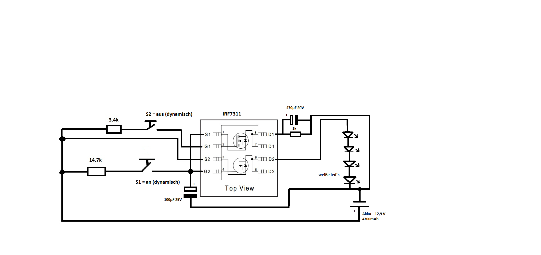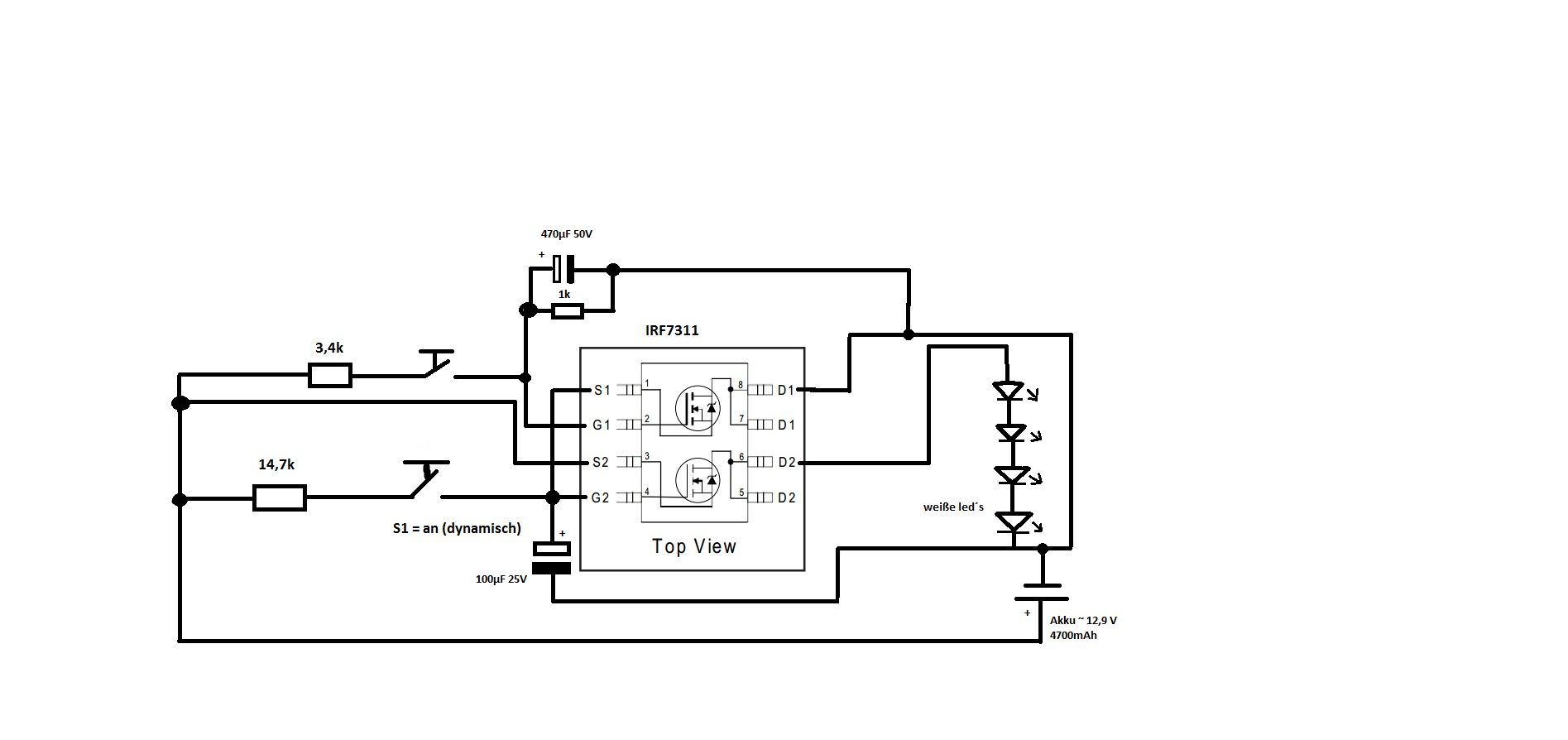 Hier mal der schaltplan insgesammt. Ich habe diesen mit einem STP76NF75 getestet und hat einwandfrei funktioniert. Nur bei dem liegt Vgs bei~ 20v wobei dann das Gate nur 60% öffnet und die leds nicht voll leuchten.