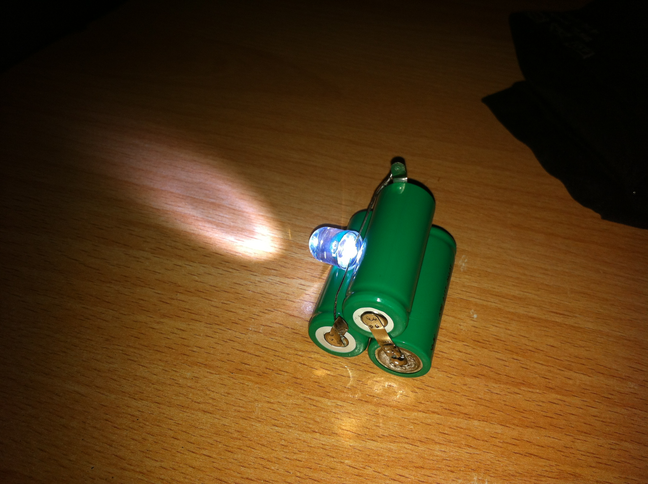 Yep, da fehlen fundamentale Grundlagen für den Betrieb einer LED. Auszug aus Wikipedia: "Eine LED kann nicht unmittelbar an eine Spannungsquelle, wie eine Batterie, angeschlossen werden: Eine weiße LED bleibt zum Beispiel beim Anlegen einer Spannung von 2,4 V (zwei NiMh-Akkus à 1,2 V) dunkel. Bei 3 V (zwei Alkali-Mangan-Primärzellen handelsübliche nichtaufladbare „Batterien“) erreicht sie gerade 30 % der Nennleistung. Drei Akku-Zellen mit zusammen 3,6 V jedoch steigern die Leistungsaufnahme auf über 150 %, ohne aktive Kühlung fällt die LED nach kurzer Zeit aus. Die rote Linie im Diagramm markiert eine etwas abweichende Kennlinie, verursacht durch Exemplarstreuungen der Halbleitereigenschaften beziehungsweise lokale Temperaturerhöhungen. Daher kann der Strom auch bei konstant gehaltener Durchlassspannung um mehr als 50 % anwachsen. Aus diesem Grund betreibt man LEDs ausschließlich mit Maßnahmen zur Strombegrenzung." Das Bild hierzu: http://upload.wikimedia.org/wikipedia/commons/7/7c/Ledwhitecharcurp.png