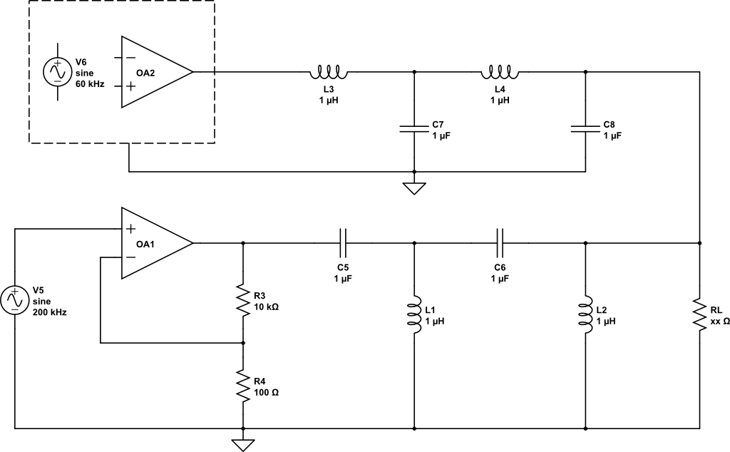 Die Bauteilwerte haben da jetzt nichts zu sagen. Das Ding ist, dass das 60 kHz Signal der Kommunikation dient. Der Verstärker ist nur auf einer Seite und die Sendeempfänger auf beiden Seiten der Übertragungsstrecke. Das muss also auf das verstärkte Signal addiert werden.