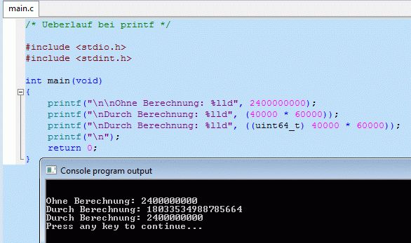 Georg G. (df2au) schrieb: > Es gibt Gerüchte, wonach der Typ "Integer" nicht auf allen Maschinen 16 > Bit breit ist. Bei manchen Compilern ist er 32 Bit breit. Damit passt > 100000 auch in ein Integer und den kleine Fehler mit dem "l oder nicht > l" verzeiht der Compiler, vielleicht sogar ohne Warnung (die der gute > Programmierer ohnehin abstellt, denn er weiß alles besser). Karl Heinz Buchegger (kbuchegg) (Moderator) konterte > Bitte Georg. > Wir reden hier von einem 8051, einem 8-Bit µC. > Es ist nicht zielführend, wenn du den Fragesteller jetzt auch noch mit > Spitzfindigkeiten zusätzlich verwirrst. Man könnte dazu anmerken, wenn der int-Typ 32-bit umfasst stellt sich das Problem mit printf auch wieder, wenn die Zahlen dort dann nicht mehr hineinpassen. Siehe Anhang. Einmal mit und ohne expliziter Typumwandlung nach 64-bit signed int. PC halt, aber das gleiche Problem. Also nix mit "impliziter Umwandlung".