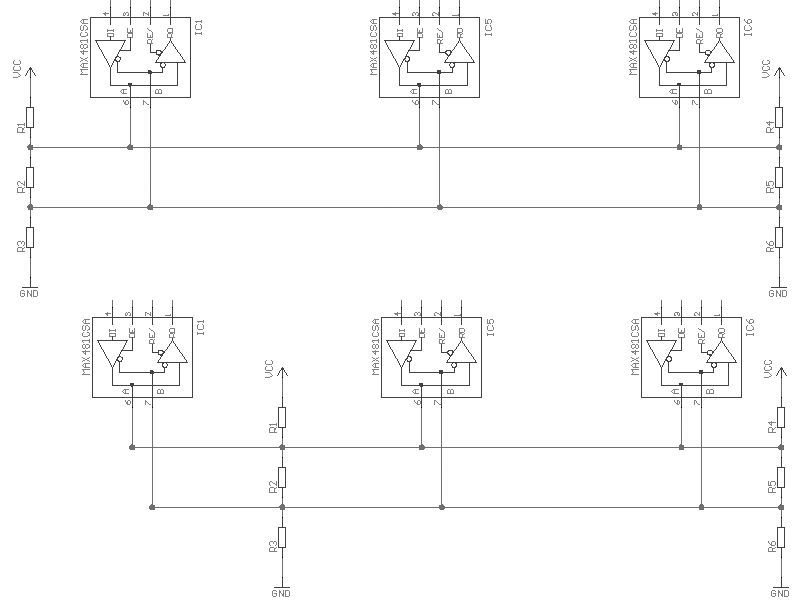 Die untere Skizze zeigt wie man's nicht machen sollte. Abschlusswiderstände gehören immer an die Endpunkte eines RS485 Bussystems.