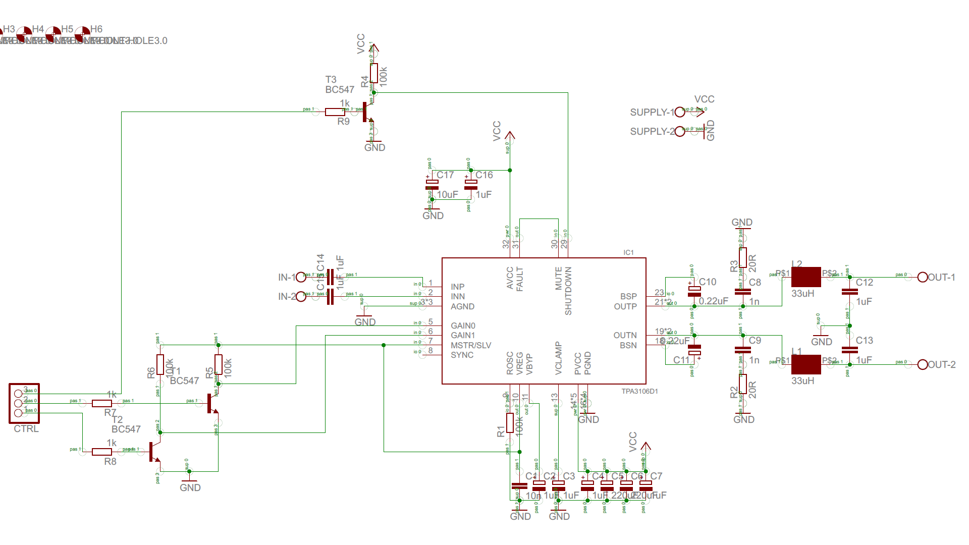 Hallo zusammen, ich bin leider völlig mit meinem Latein am Ende. Ich versuche seit 2 Tagen vergeblich eine 40W Endstufe mit einem TPA3106D1 in Betrieb zu nehmen. Ich hab mich bei der Schaltung eigentlich ziemlich genau ans Datenblatt, bzw. das Eval-Board von TI gehalten (meine Schaltung im Anhang). Gestern ist mir ein Chip an einem 4 Ohm Lautsprecher abgeraucht, ohne je einen Mucks von sich gegeben zu haben, obwohl im Datenblatt als minimale Last 4 Ohm angegeben sind. Heute hab ich dann einen neuen Amp draufgelötet und an 16 Ohm betrieben. Das hat auch ganz kurz funktioniert, d.h. es kam hinten die gleiche Musik raus, die ich vorne reingeschickt hab. Auch die Steuerung von Gain und Shutdown via uC hat genau das gemacht, was sie sollte. Dann hab ich den Amp aus- und wieder angemacht und seither geht nix mehr. Die Spannungen am Eingang passen alle (Vreg, Mute, Shutdown usw.). Aber zwischen Out- und Out+ liegen immer 12V (=Versorgungsspannung). Seltsamerweise liegt zwischen Out- und GND +12V und zwischen Out+ und GND 0V. Klar, dass der Lautsprecher so nicht arbeiten will. Ich versteh halt nicht, warum es kurz funktioniert hat und nun gar nix mehr geht. Kurzschlüsse sind mit ziemlicher Sicherheit keine auf der Platine. Stromaufnahme sieht auch vernünftig aus (ca. 0.8 A bei 12 V Betriebsspannung mit 16 Ohm Last). Hat jemand Erfahrungen mit dem IC? Bin für jede Anregung dankbar...