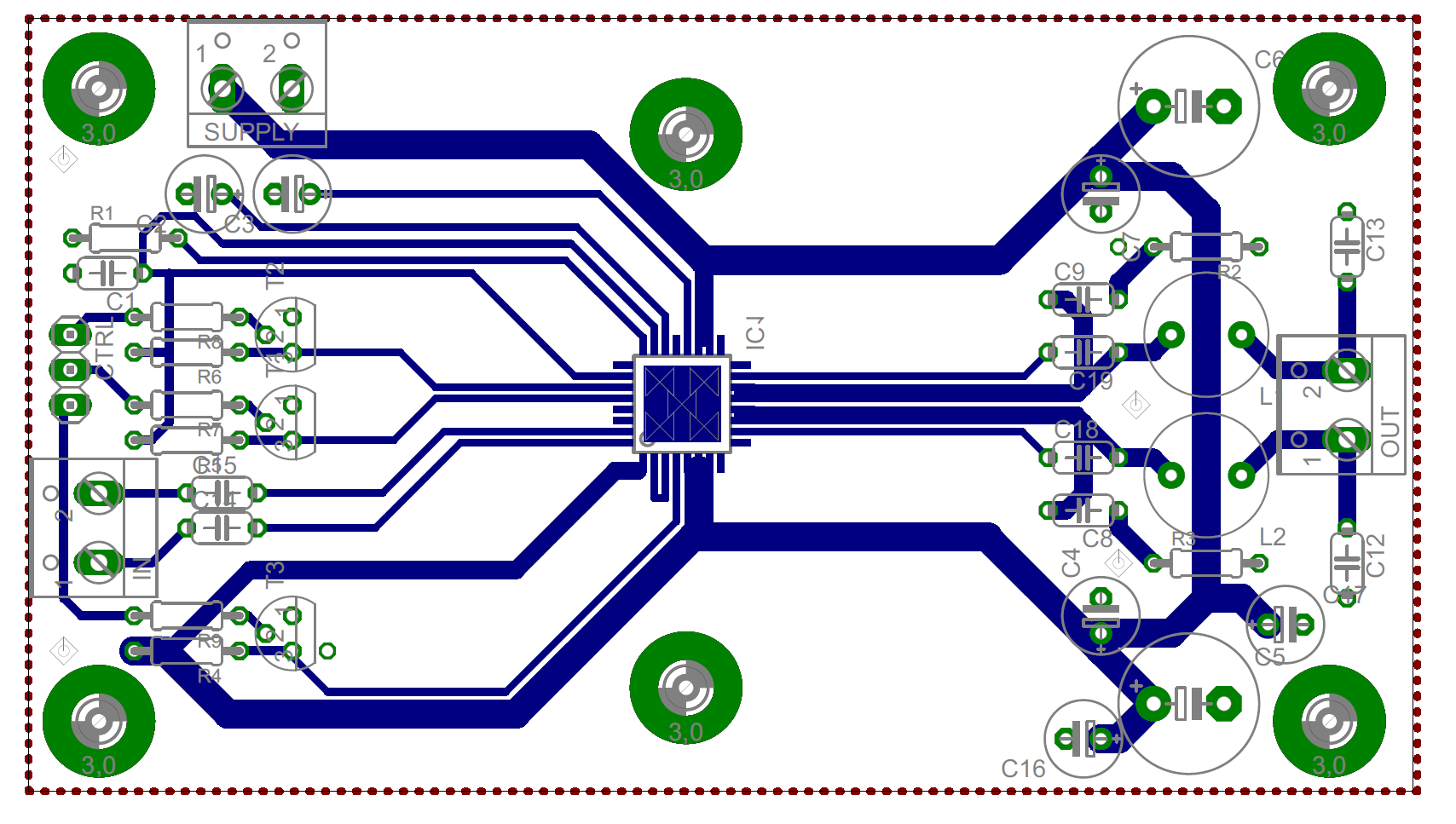 Elf von Dreizehn schrieb: > Da scheint einiges Falsch zu sein. Zeig mal das Layout Oh oh, das hört sich nicht gut an... :-/ Schaltplan ist im ersten Post, Layout ist hier dabei... Top und Bottom sind komplett mit Masse belegt (dafür die Durchkontaktierungen, bzw. Bohrungen). In der Mitte ist deshalb so viel Platz freigelassen, weil ich nicht wusste, wie warm der Amp wird und ich evtl. einen Kühlkörper montieren wollte. Kann es denn auch damit zusammenhängen, dass ich an einigen Stellen Elkos verwende, an denen TI normale Keramikkondensatoren im Schaltplan hat?
