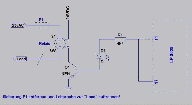 Hallo zusammen, ich habe auch Funktsteckdosen (Chip LP8029) verwendet um bei Stehlampen die Taste zum Ein-Ausschalten bzw. Dimmen zu ersetzen. Ich baute daher die Funksteckdosen so um, dass die 230V direkt von den Stecker- zu den Dosenkontakten führt. Weiterhin versorgte ich die restliche Platine direkt mit 230V. Die Sicherung baute ich aus und kappte die Leiterbahn von dem einen 230V Anschluß zum Relaiskontakt. Somit hatte ich einen potentialfreien Kontakt. Der Pin 17 der IC wird auf 5V geschaltet, wenn man an der Fernbedienung sendet (egal ob An- oder Austaste). Selbst beim kürzesten Tastendruck geht der Pin für 1 Sekunde auf 5V. An den Pin 17 legte ich den 4k7 Widerstand der zwischen Pin 11 war und veband ihn wieder mit der Basis des NPN Transistors der das Relais schaltet. Den Relaiskontakt habe ich dann mit einem 2-adrigen Kabel parallel zur Stehlampentaste vebunden. Jetzt kann ich die Lampen Ein- und Ausschalten und bei lägerem Drücken der Tast auf der Fernbedienung auch dimmen. Viele Grüße TJ