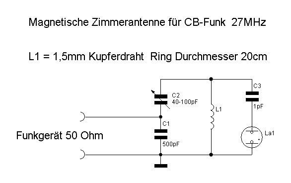 Hier ist mal ein Beispiel einer Magnetischen Antenne für CB-Funk. Diese Antenne habe ich aufgebaut, und funktioniert Einwandfrei. C1 und C2 bilden den Schwingkreiskondensator, und dienen gleichzeitig zur Transformation. Das Funkgerät liefert etwa 20V HF-Spannung an der Antennenbuchse, und wird dann durch C1 C2 auf einige 100V hochtransformiert. La1 ist eine Glimmlampe, und dient als Resonanzindikator. Resonanz wird mit C2 eingestellt, Helligkeitmaximum der Glimmlampe. C1 etwa 10*C2, größer oder kleiner probieren. Bei Optimum hat dann die Antenne die größte HF-Spannung. Bei 13,56 MHz müßte dann der Ring und die Kondensatoren entsprechend größer sein.