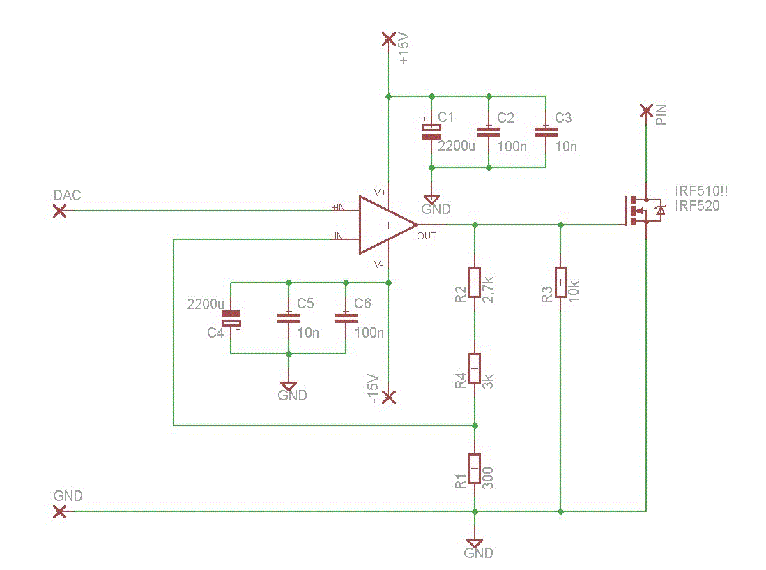 Peter schrieb: > Auch ist es egal, ob ich den Ausgang belaste, oder nicht. Ist mit Ausgang der OPV-Ausgang gemeint oder der Ausgangspin des MOSFET? Wenn MOSFET dran: Note 15 im Datenblatt des OPV verlangt CLoad <10pF, versuch mal einen R in Reihe zum Gate. Nur mal aus Neugier, welchen Zusammenhang willst du eigentlich zwischen dem DAC-Ausgang und dem Drain des IRF erreichen? Arno