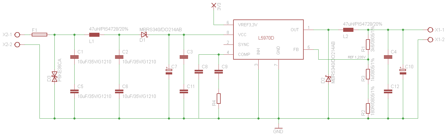 Für L1 würde ich eher hierzu greifen: https://secure.reichelt.de/Power-Induktivitaeten-SMD/L-PIS4728-470-/3/index.html?;ACTION=3;LA=2;ARTICLE=73207;GROUPID=3709;artnr=L-PIS4728+470%C2%B5;SID=10T1OKNn8AAAIAAEJbgxw3ae80d21ff4656ec4780a27ade2a260a Die Kerkos C2, C3, C5 und C6 bitte als SMD-Kerkos auslegen. Die Kerkos in Bauform 0805 wählen und zwei in Reihe schalten. 90° zueinander layouten. Wenn Du in Summe 100n benötigst (nicht geklärt), nimmst du 220n-Kerkos. Aus Gleichteilsicht wäre das dann 0805/220n/X7R/50V/10% oder mit 100n. Die Elkos können auch als SMD-Elkos genommen werden. Reichelt hat da Panasonic-SMD-Elkos im Programm, die passen. Vorne mindestens 35V, hinten dann mindestens 6V3. Die haben auch SMD-Polymerkondensatoren, vielleicht ein wenig oversized bei 52kHz, die werden aber wesentlich länger durchhalten. Aber ob man das braucht, musst Du entscheiden. D3 mit 40V Spannungsfestigkeit wählen, z.B. SB140 oder noch besser, die SK24A (die 1A-Version haben die ja nicht), weil SMD. Die kannst Du dann auch für D1 einsetzen. D2 als 36CA wählen. Mir fehlt jetzt noch die Simulation des Bordnetzfilters und der Power-Rasil des Reglers selbst, um eine endgültige Aussage über L2, C5 und C6, sowie der Primär- und Sekundärkondensatoren am Regler treffen zu können. Das könntest Du eigentlich mal tun, sonst wird das hier zur Ratestunde.